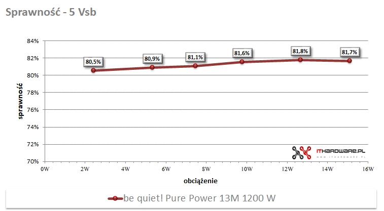W zakresie linii pomocniczej +5 VSB zasilacz be quiet! Pure Power 13M 1200 W osiągał sprawność od 80,5% (T1) do 81,8% (T5), przy napięciu mieszczącym się w zakresie 5,033–5,05 V.