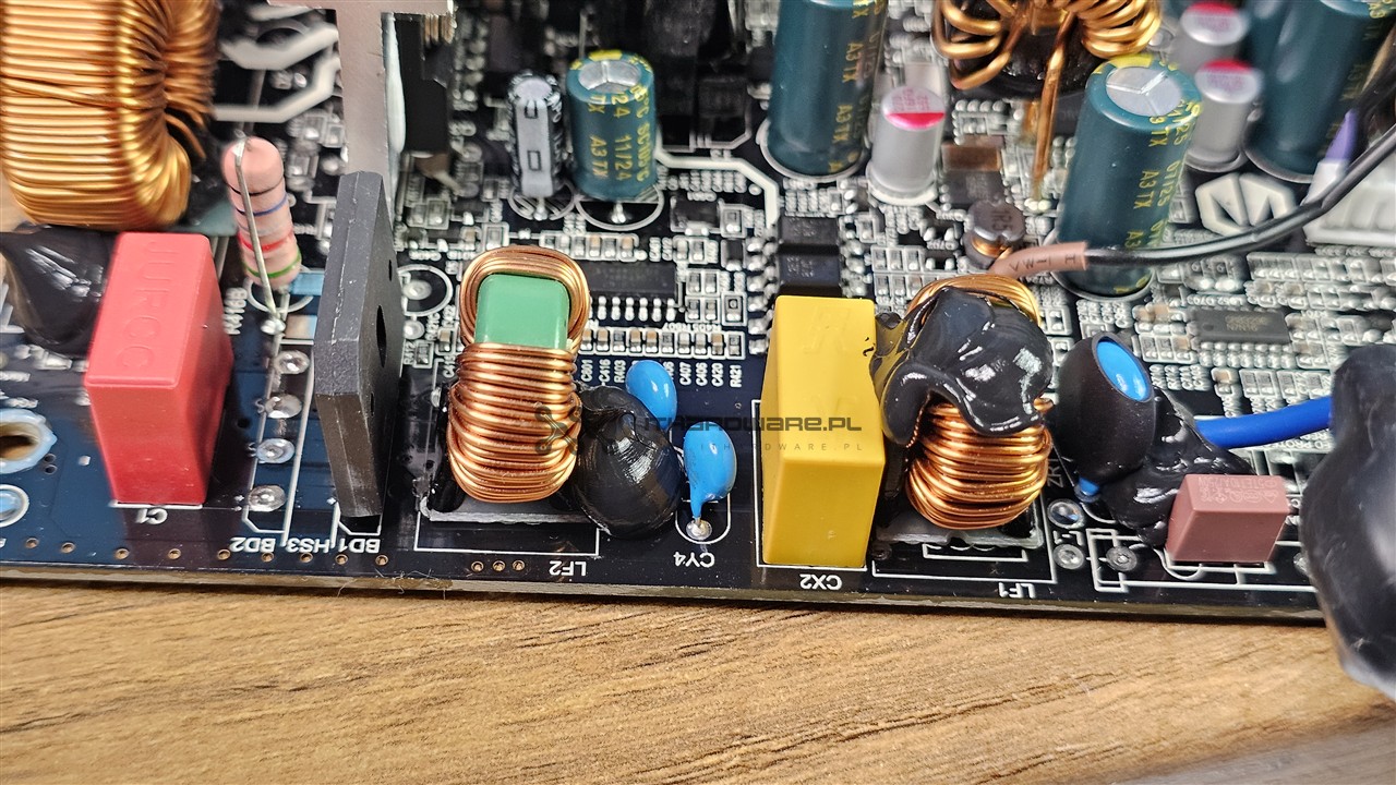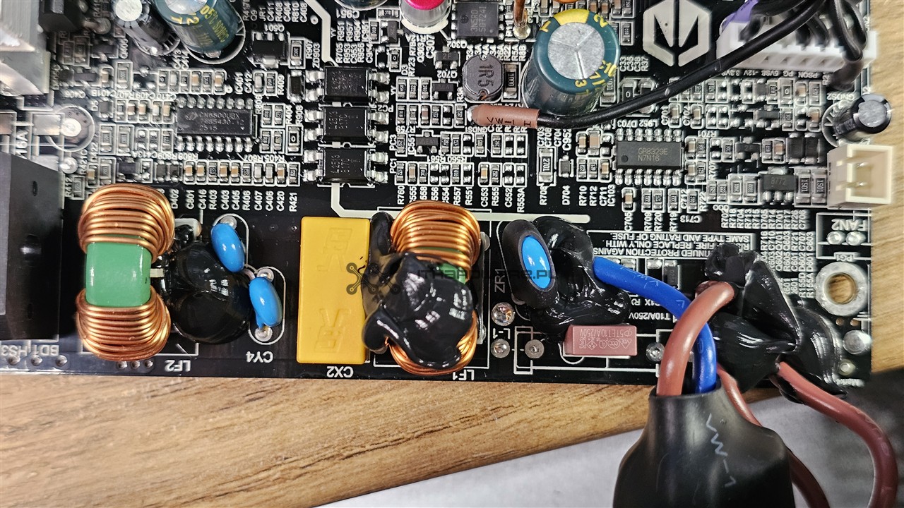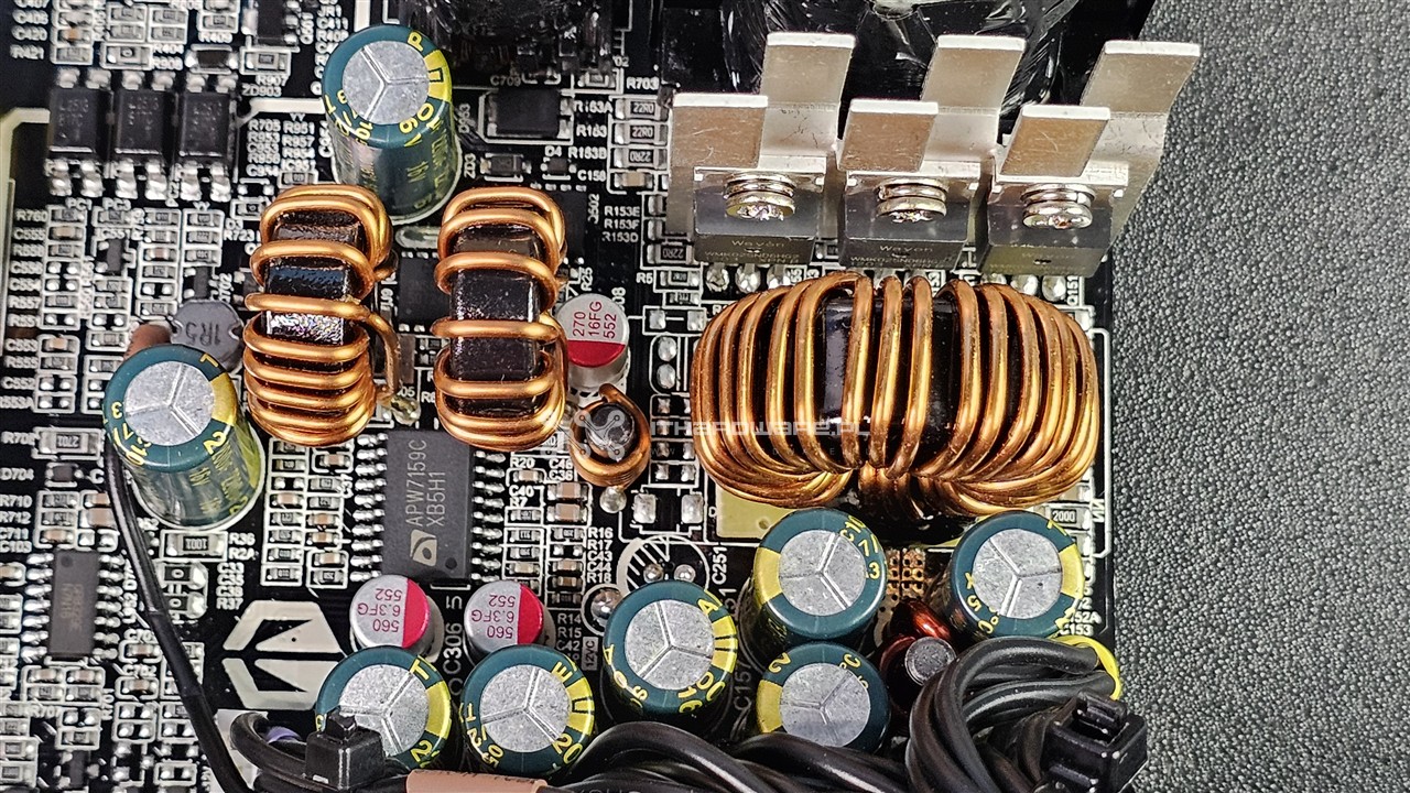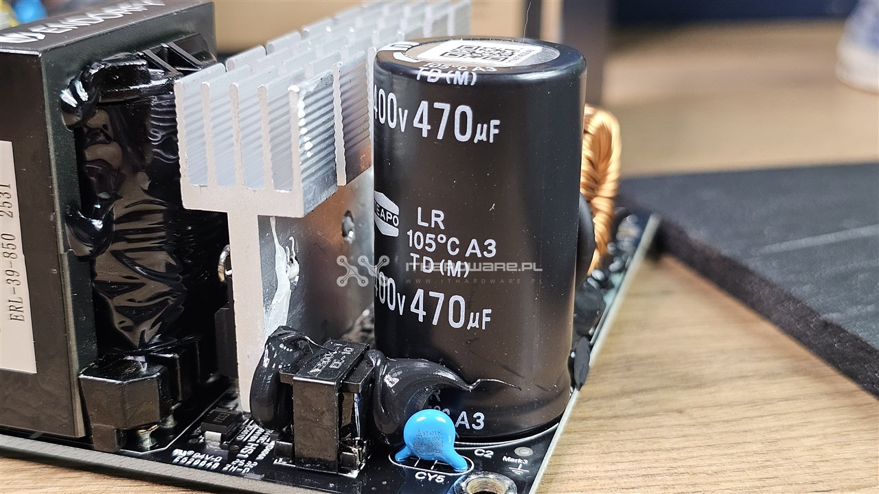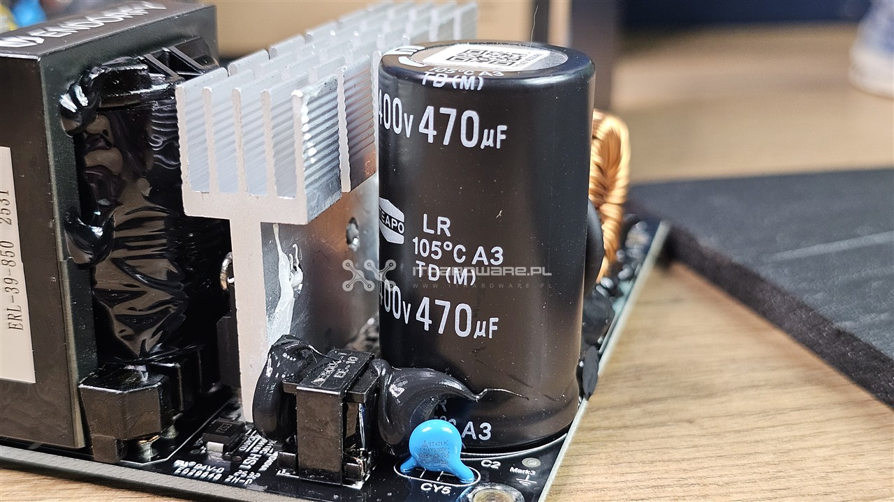 W części wejściowej zasilacza znajduje się pełny filtr EMI zaczynając się już na wtyku AC, wyżej mostek prostowniczy oraz sekcja aktywnego PFC z dużym dławikiem i kondensatorem wysokonapięciowym. Niżej umieszczono sekcję kluczowania oraz główny transformator i mniejszy sekcji 5 Vsb. Po stronie wtórnej rozmieszczono synchroniczny prostownik linii +12 V, a bezpośrednio obok znajduje się bateria kondensatorów elektrolitycznych i kilka aluminiowo-polimerowych. Obok mamy przetwornice DC-DC tym razem przylutowanych na głównym laminacie. W tym modelu wiązki przewodów są stałe, więc kable zostały przylutowane bezpośrednio do głównego PCB, zamiast wykorzystania osobnej płytki z gniazdami modularnymi.