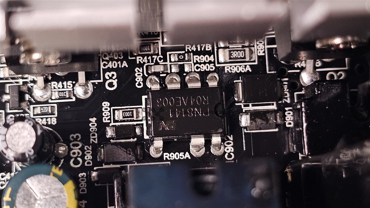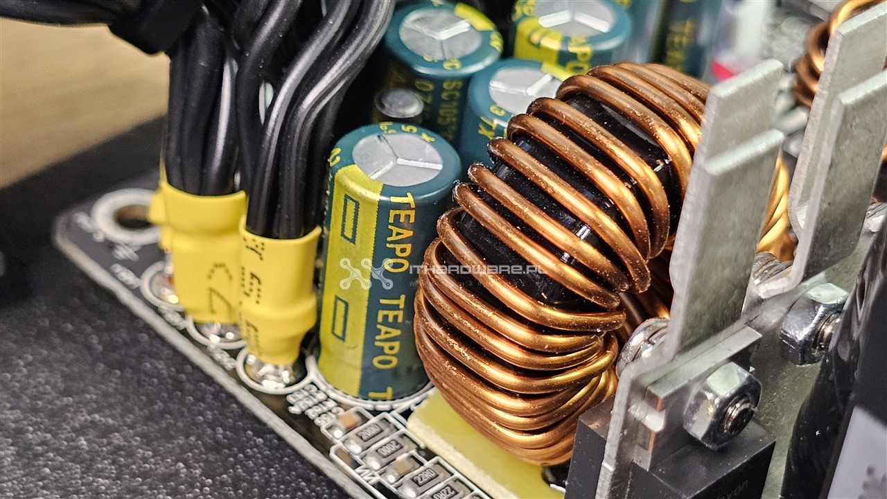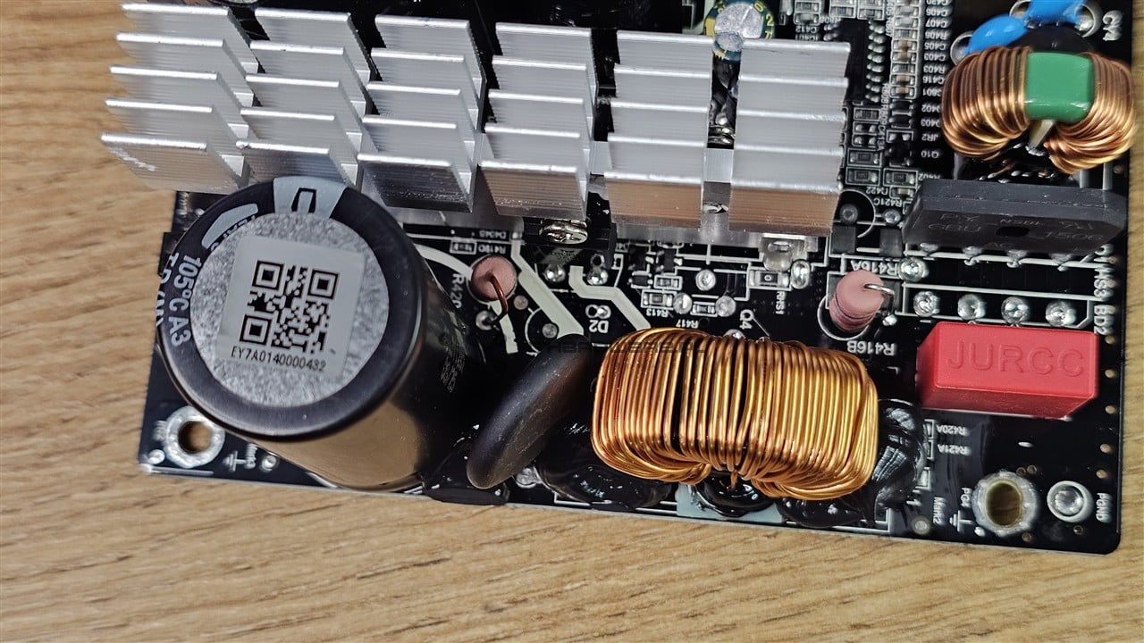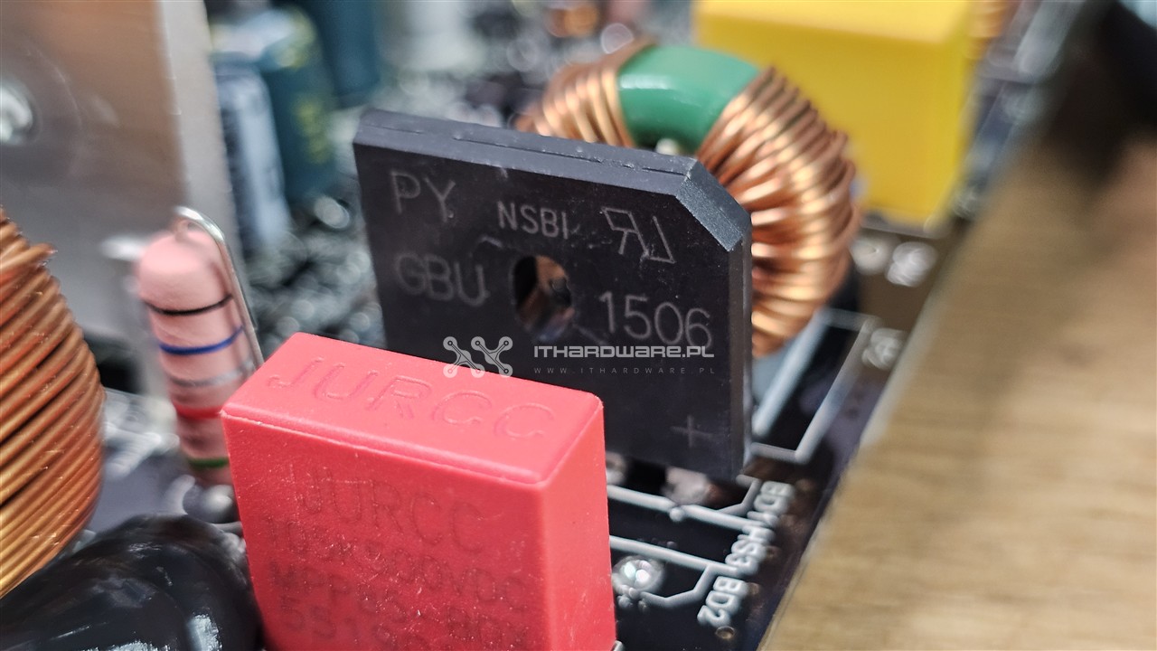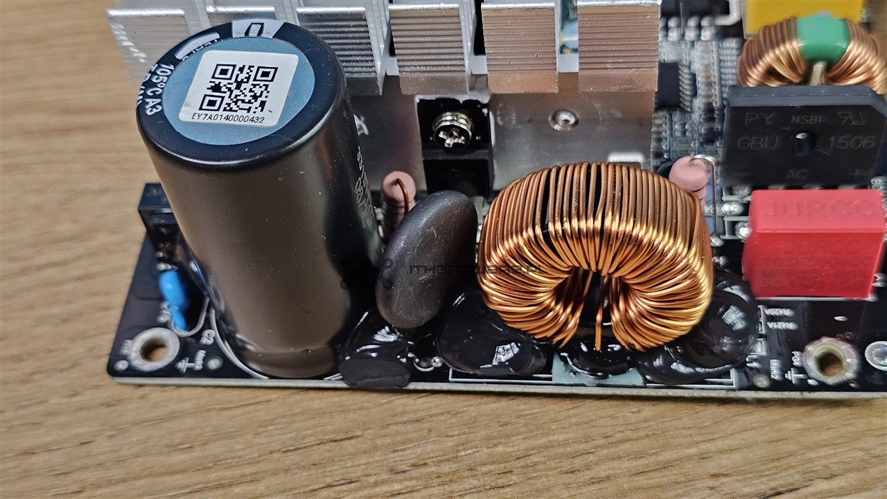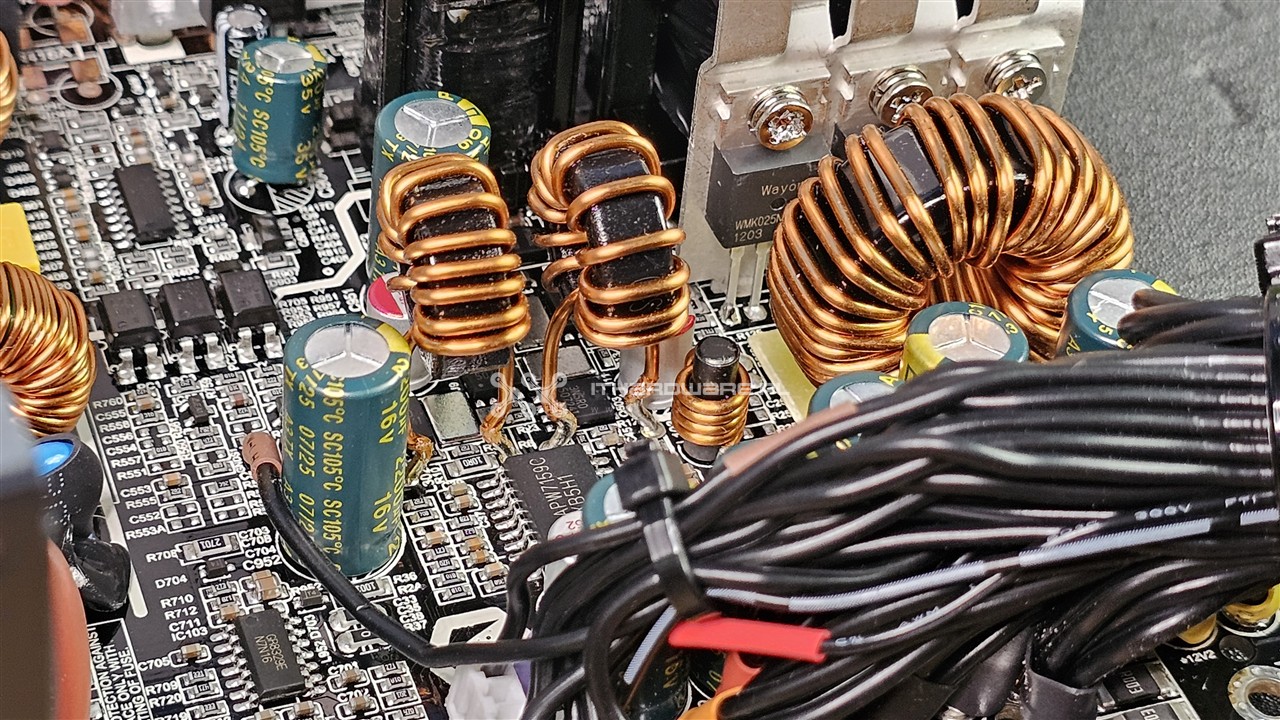 W części wejściowej zasilacza znajduje się pełny filtr EMI zaczynając się już na wtyku AC, wyżej mostek prostowniczy oraz sekcja aktywnego PFC z dużym dławikiem i kondensatorem wysokonapięciowym. Niżej umieszczono sekcję kluczowania oraz główny transformator i mniejszy sekcji 5 Vsb. Po stronie wtórnej rozmieszczono synchroniczny prostownik linii +12 V, a bezpośrednio obok znajduje się bateria kondensatorów elektrolitycznych i kilka aluminiowo-polimerowych. Obok mamy przetwornice DC-DC tym razem przylutowanych na głównym laminacie. W tym modelu wiązki przewodów są stałe, więc kable zostały przylutowane bezpośrednio do głównego PCB, zamiast wykorzystania osobnej płytki z gniazdami modularnymi.