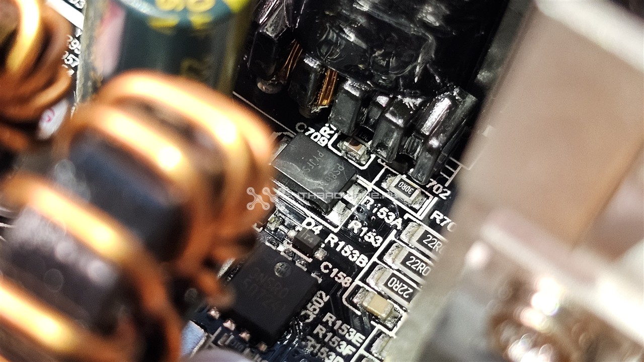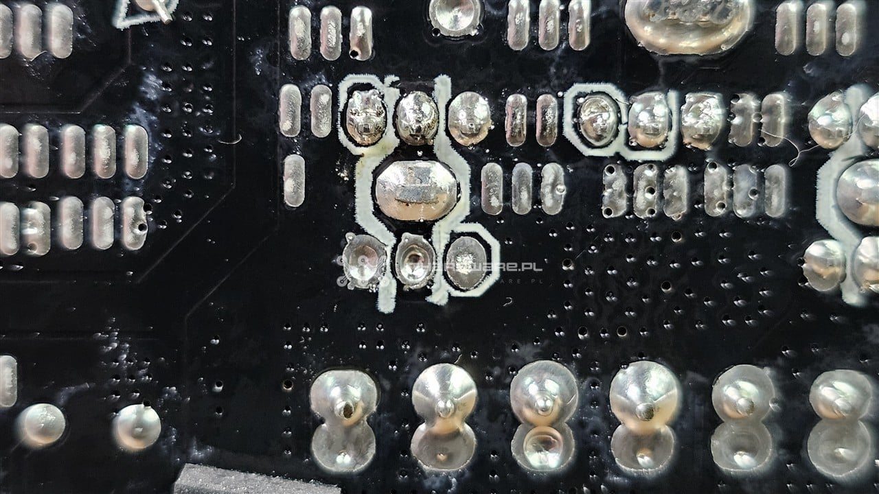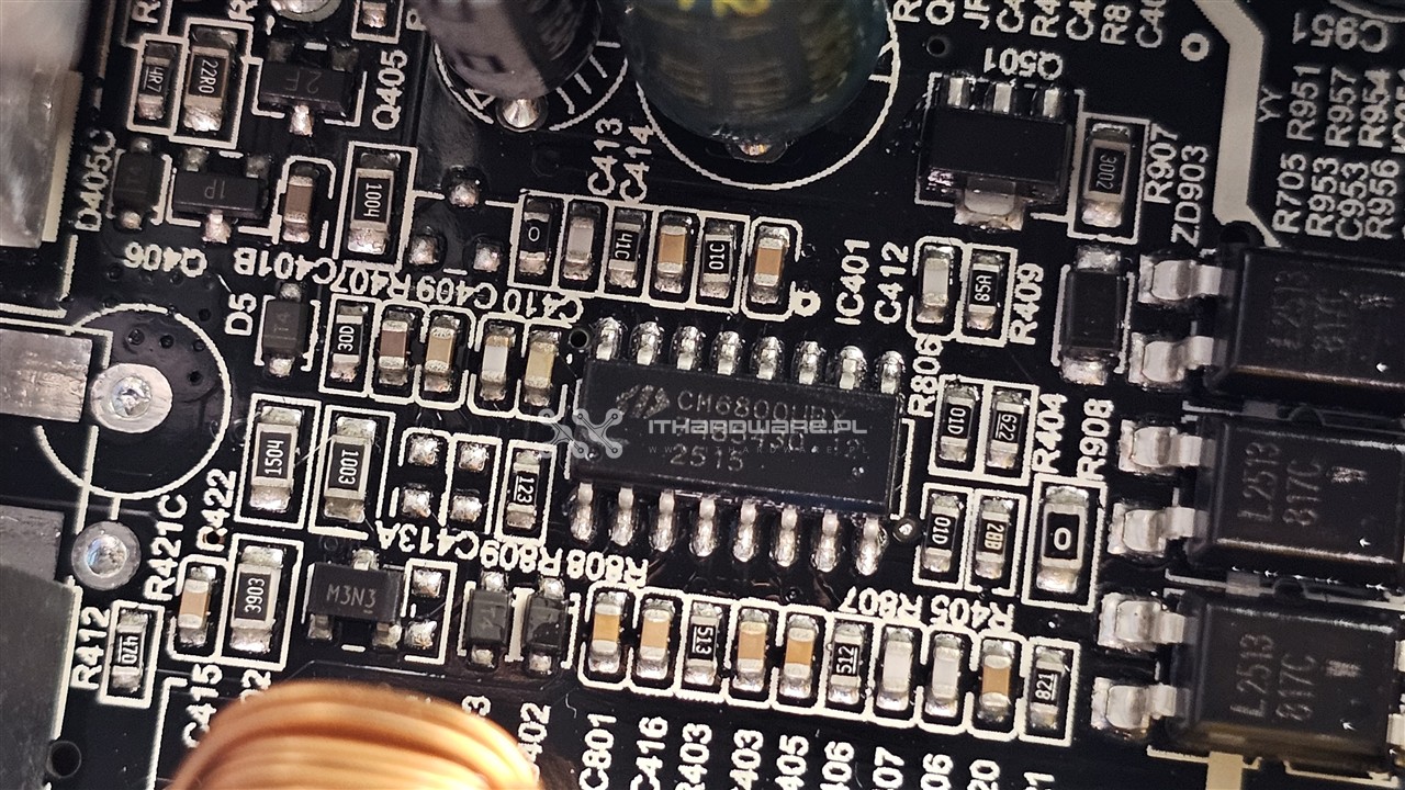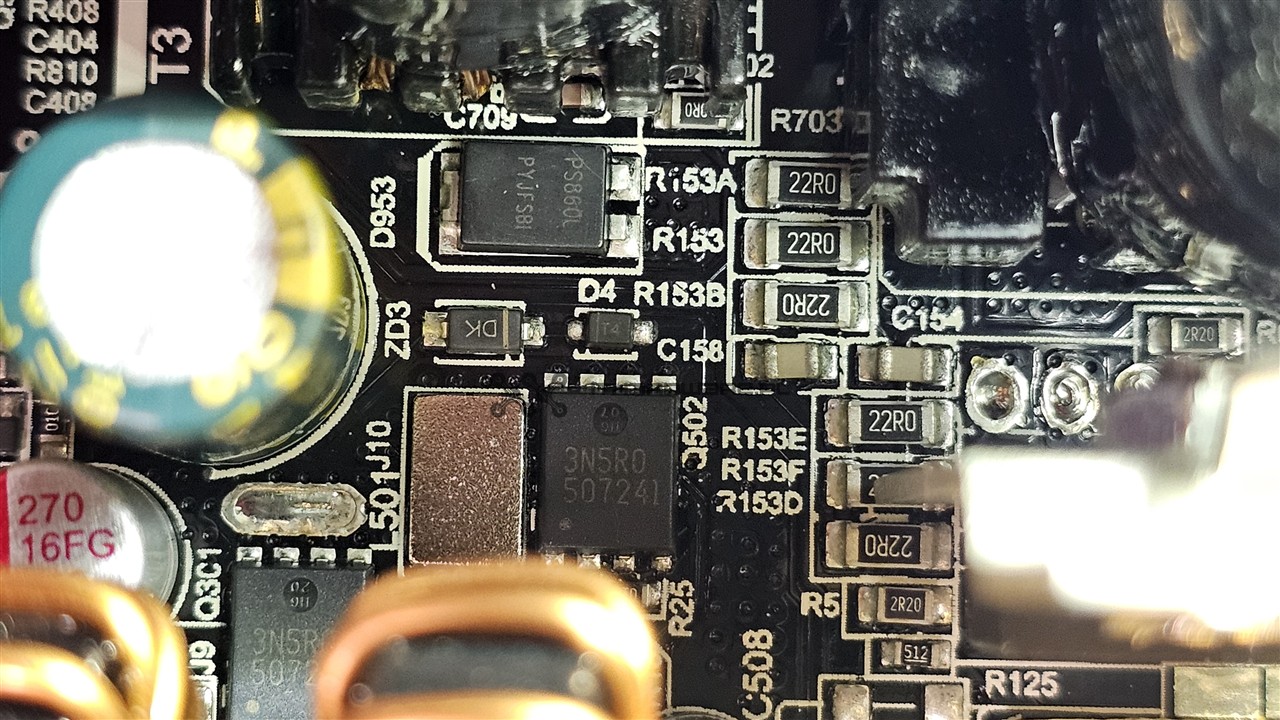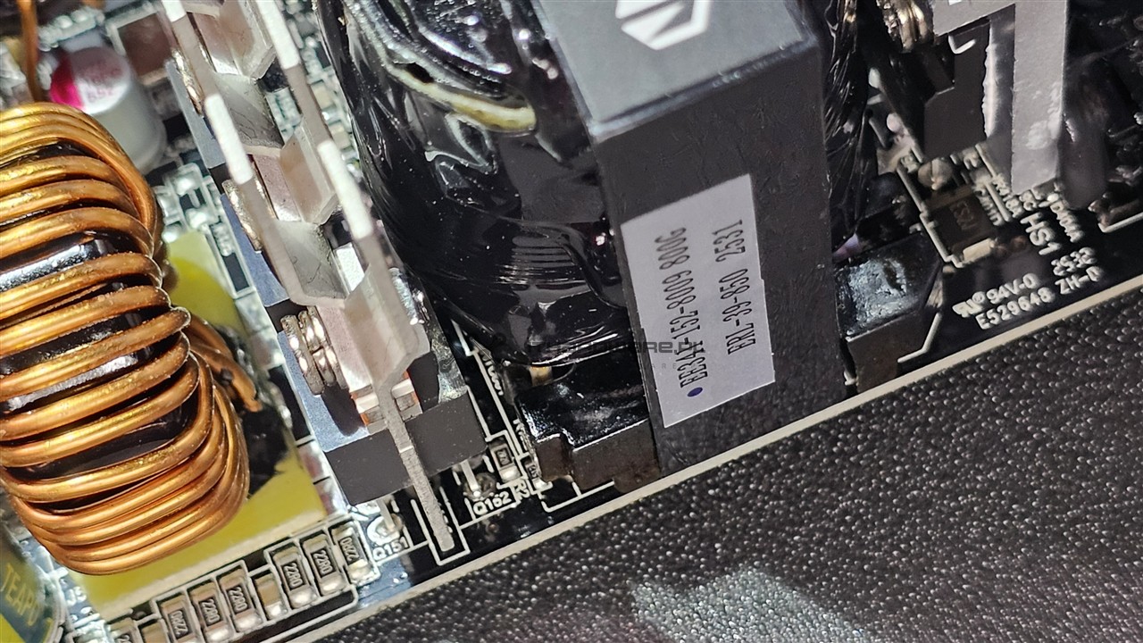 W części wejściowej zasilacza znajduje się pełny filtr EMI zaczynając się już na wtyku AC, wyżej mostek prostowniczy oraz sekcja aktywnego PFC z dużym dławikiem i kondensatorem wysokonapięciowym. Niżej umieszczono sekcję kluczowania oraz główny transformator i mniejszy sekcji 5 Vsb. Po stronie wtórnej rozmieszczono synchroniczny prostownik linii +12 V, a bezpośrednio obok znajduje się bateria kondensatorów elektrolitycznych i kilka aluminiowo-polimerowych. Obok mamy przetwornice DC-DC tym razem przylutowanych na głównym laminacie. W tym modelu wiązki przewodów są stałe, więc kable zostały przylutowane bezpośrednio do głównego PCB, zamiast wykorzystania osobnej płytki z gniazdami modularnymi.