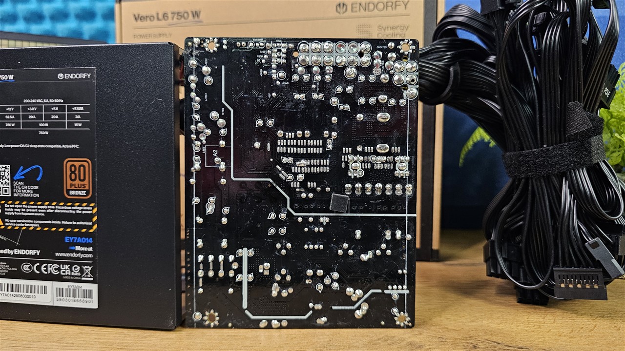 Endorfy Vero L6 750 W korzysta z nowej platformy, której producentem OEM jest Jiumeng, co stanowi zmianę względem dotychczasowego dostawcy. Układ wnętrza jest dość standardowy i opiera się o topologię APFC + Double Forward po stronie pierwotnej, synchroniczny prostownik po stronie wtórnej oraz przetwornice DC-DC dla linii +5 V i +3,3 V. Podobnie jak w niektórych prostszych konstrukcjach (np. platformach spotykanych w segmencie Volcano HEX), moduły DC-DC zrealizowano bezpośrednio na głównym PCB, co upraszcza konstrukcję i skraca ścieżki sygnałowe.