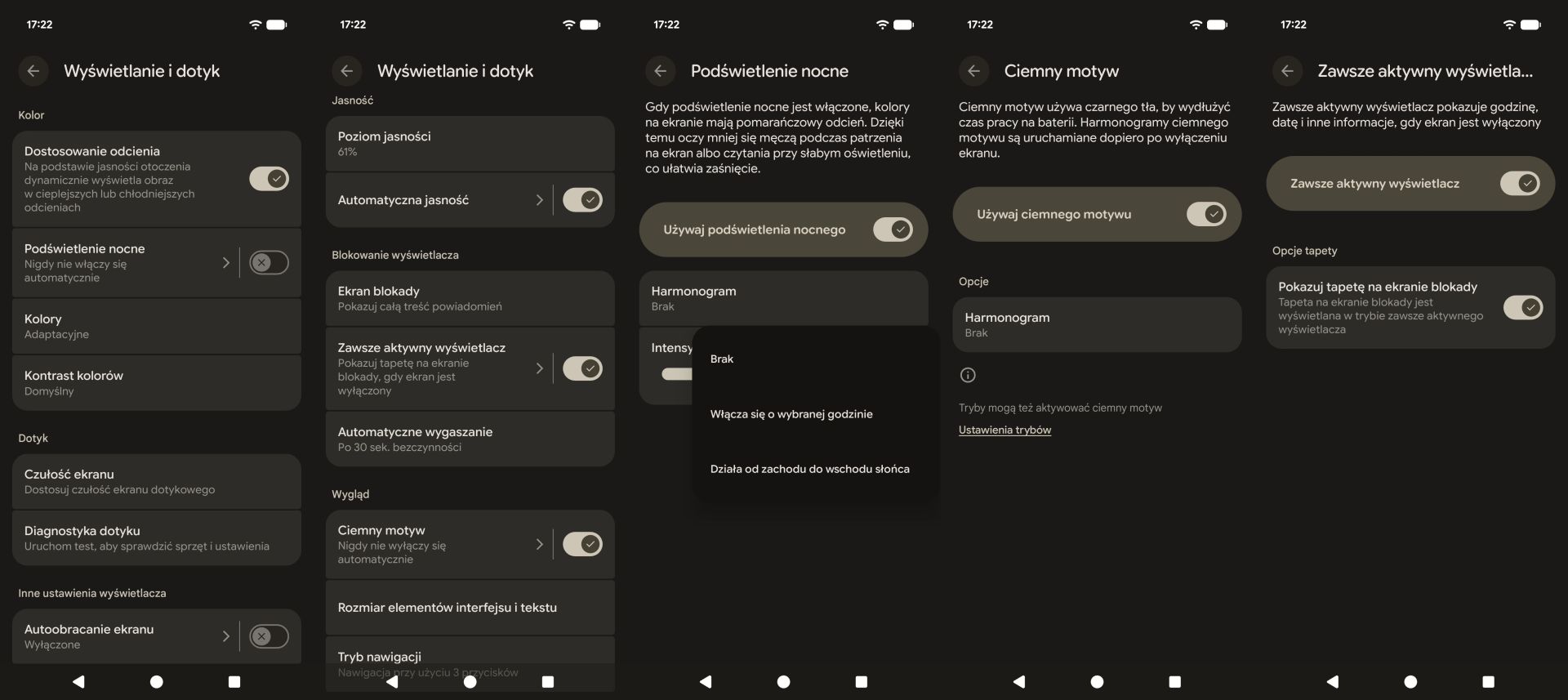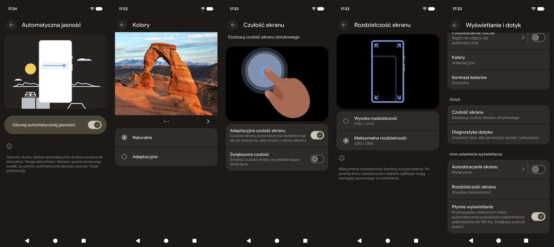 A co w ustawieniach? Poziom jasności, włączenie automatycznej jasności, opcje ekranu blokady, ciemny motyw (manualnie lub według harmonogramu, w tym ustawionego samodzielnie, od zachodu do wschodu słońca i w porze snu), podświetlenie nocne (manualnie lub według harmonogramu i z opcją dopasowania intensywności), kolory (naturalne i adaptacyjne) czy rozdzielczość (włączona domyślnie Wysoka 1080x2210 pikseli i Maksymalna (1280x2856 piksele). To właśnie tu wybierzemy też sposób nawigacji po systemie (gesty i trzy przyciski), dostosujemy czułość ekranu, rozmiar interfejsu i tekstu, włączymy wygaszacz ekranu podczas ładowania czy Always-on display.
