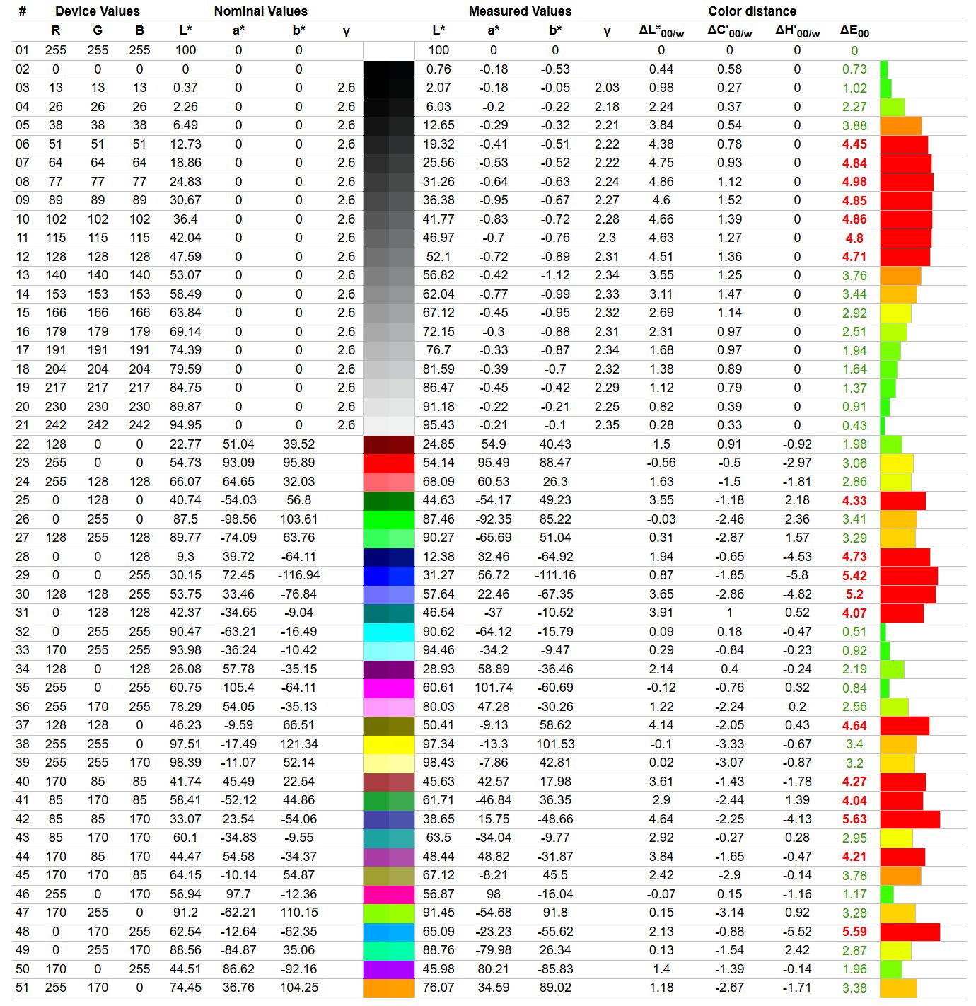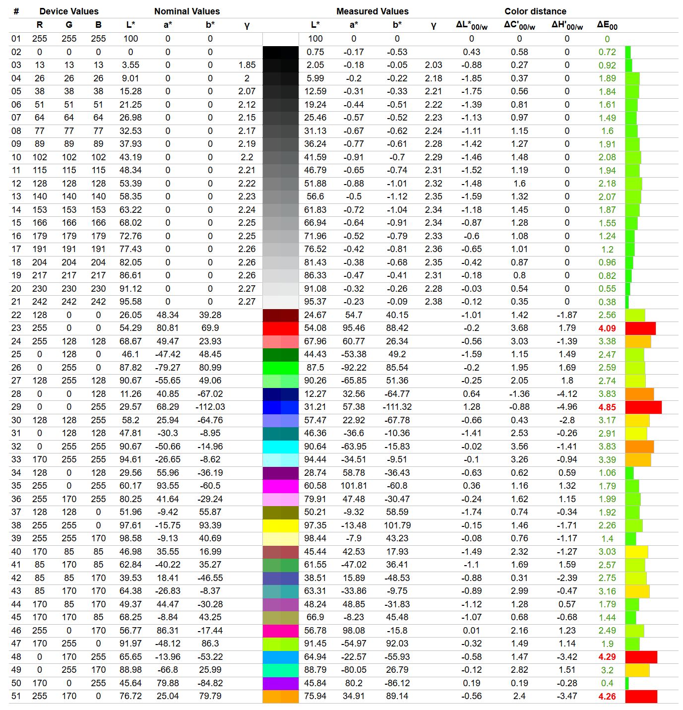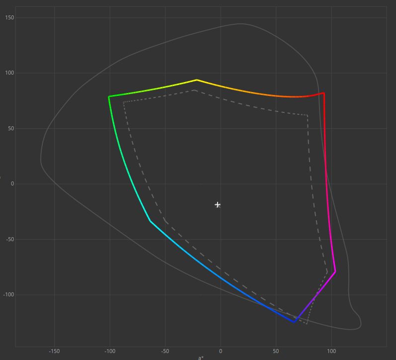 Z racji tego, że urządzenie ma 8-bitowe sterowanie i nie oferuje szerokiego gamutu, podczas kalibracji nie da się uniknąć schodkowania gradientów, a oprogramowanie profilujące zawsze dodatkowo obniża liczbę barw możliwych do wyświetlenia. Ustawienia fabryczne nie są najgorsze, więc jedyne, co należy zrobić, to obniżyć jasność i wyrównać temperaturę bieli - ustawienia dla sampla powyżej. Profilowanie okazuje się obniżać średni błąd Delta E, który spadł do 0,52, ale dla czystego niebieskiego wciąż pozostaje relatywnie wysoki (3,85). Jasności w gradiencie szarości zostały jednak wyrównane.