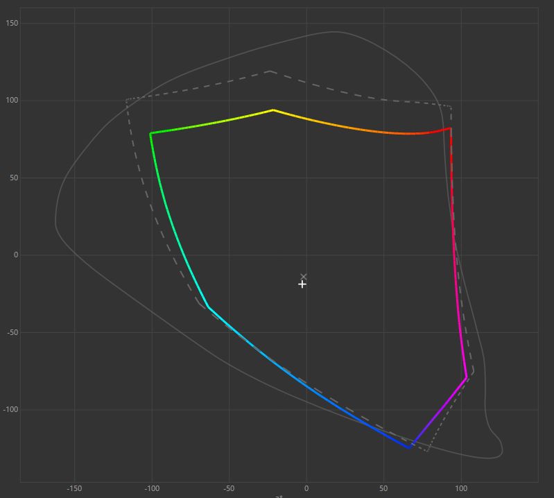 Podobnie jak w przypadku fabrycznej kalibracji pod kątem odwzorowania kolorów, bo na domyślnych ustawieniach średni błąd Delta E dla sRGB wynosi tylko 2,16 (maks. 4,85), co jak na tę klasę monitorów jest bardzo dobrym wynikiem, bo uznaje się, że dopiero błędy powyżej 3 są widoczne "na oko". W trybie sRGB wyniki te spadają do odpowiednio 2,1 i 4,22. Jedyne, na co można lekko kręcić nosem, to fakt, że największy błąd odnosi się do czystego niebieskiego, czyli jednego z podstawowych kolorów, ale nie jest to przecież monitor dla grafików. Przebieg gammy lokalnej wypada nieźle, bo wartości w całej rozciągłości są jedynie minimalnie zawyżone, co lekko przekłada się na intensyfikację cieni.