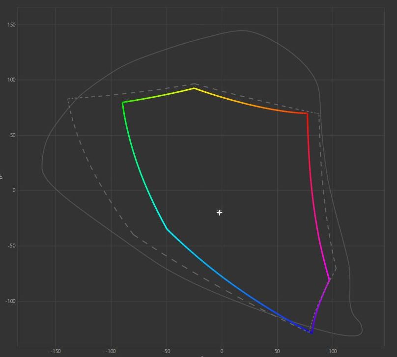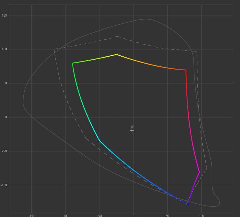 Pomiary kolorymetrem zaczynamy od zmierzenia pokrycia popularnych gamutów. Okazuje się, że nowy wariant GB2770HSU otrzymał tę samą matrycę co poprzednik, więc wyniki są tu bardzo zbliżone. I tak, pokrycie dla przestrzeni kolorów sRGB wyniosło w naszych pomiarach aż 98,1% przy całkowitej jego objętości 102,5% i wygląda na to, że producent celował właśnie w ten gamut. Nieco gorzej ma się sytuacja w przypadku dwóch pozostałych popularnych standardów, czyli Adobe RGB, gdzie wartości te wynoszą odpowiednio 69,8% i 70,6% oraz DCI P3 z wynikami 72,6% w obu pomiarach. Jeśli zaś chodzi o bryłę sRGB, to niemal idealnie pokrywa się ona z wzorcem i jest jedynie nieco bardziej wyciągnięta w górnej części odpowiadającej za czerwienie i zielenie. Owocuje to lekkim wizualnym przesyceniem tych barw, ale trzeba pamiętać, że taki efekt jest lubiany przez większość użytkowników, gdyż daje wrażenie żywszych kolorów, dlatego trudno traktować to jako wadę w typowo konsumenckim modelu, nastawionym na rozrywkę.