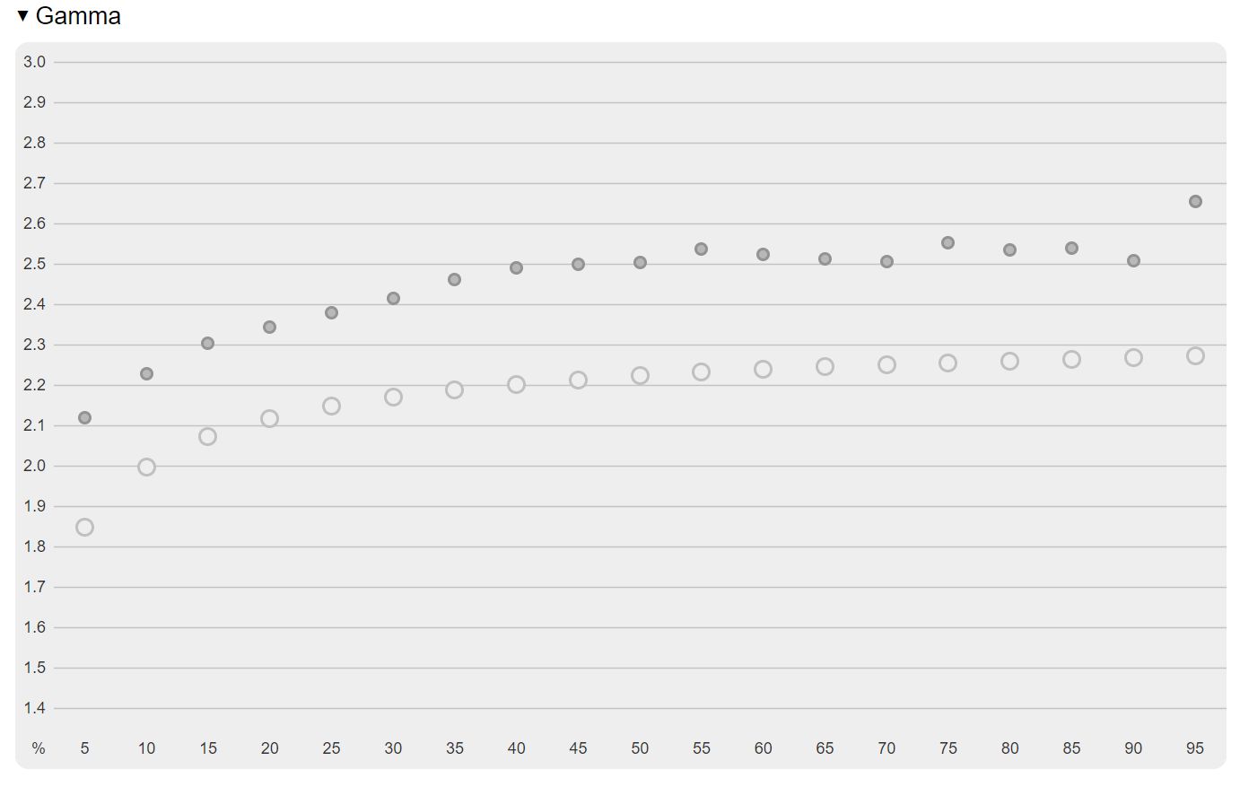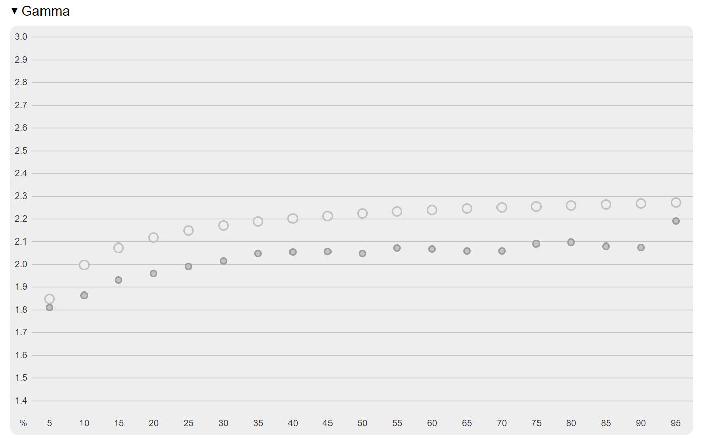 Domyślne ustawienie jasności na poziomie 50% przekłada się na wynik wyraźnie ponad 238,8 nitów, czyli blisko deklarowanej maksymalnej wartości dla tego modelu, co pokazuje, że iiyama ponownie niedoszacowała tego parametru. Kontrast także wykracza poza oficjalną specyfikację, pomimo faktu, że producent i tak obiecuje 1100:1. Tutaj zaś sprzęt pomiarowy odnotował 1568,1:1, czyli przeszło 50% więcej niż typowe 1000:1 dla IPS-ów. GB2770HSU należą się też duże pochwały za precyzję w reprodukcji kolorów, ponieważ średni błąd Delta E zamyka się w wartości 2,51. Co więcej, zmiana domyślnego ustawienia gammy lokalnej (z Gamma 2 na Gamma 1) obniża ten błąd do zaledwie 1,74. Z racji tego, że nie jest to model skierowany do grafików, dodatkowa kalibracja nie jest wymagana, a gracze wciąż otrzymują bardzo przyzwoite odwzorowanie kolorów. Tym bardziej że bardzo dobrze wypada także temperatura barwowa, bo wynik 6444 K jest bliski wzorcowego 6500K. Przebieg gammy na domyślnej wartości pozostawia nieco do życzenia, gdyż zbyt wysokie wartości praktycznie w całej długości intensyfikują cienie.