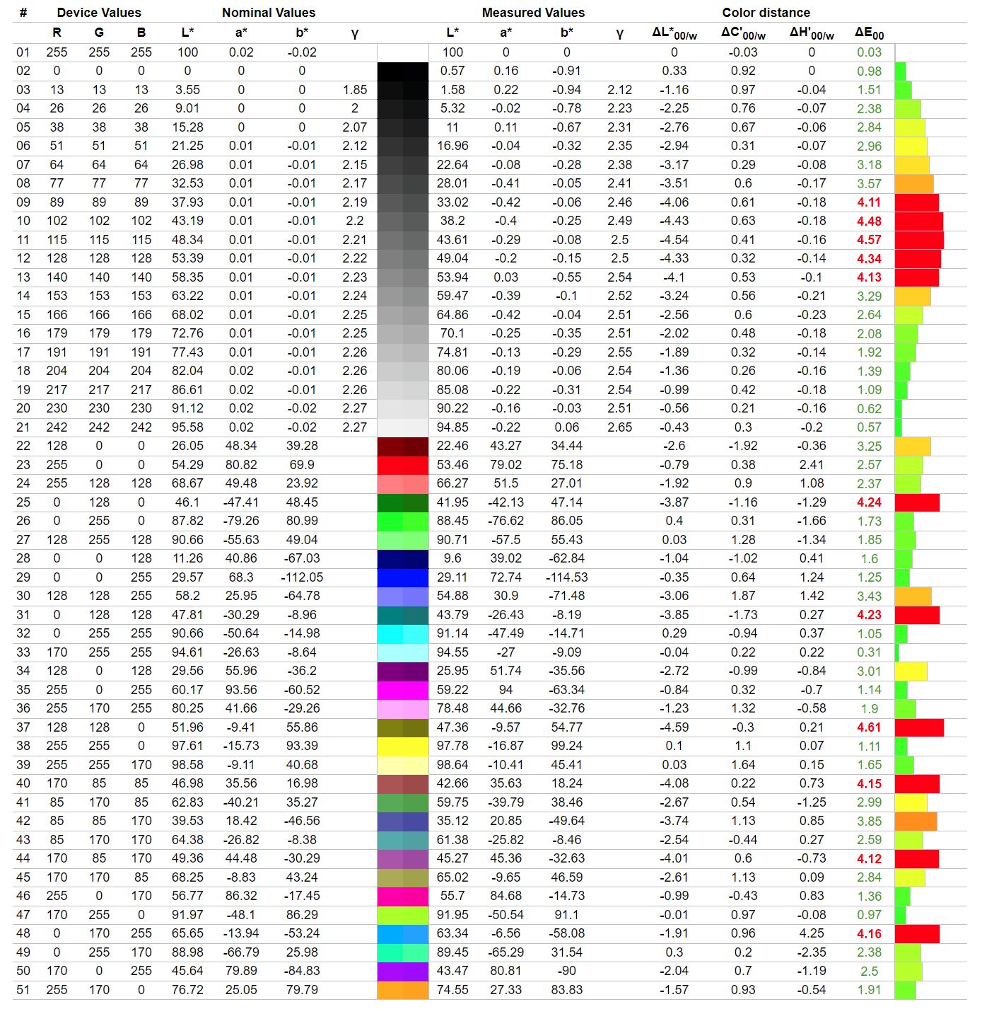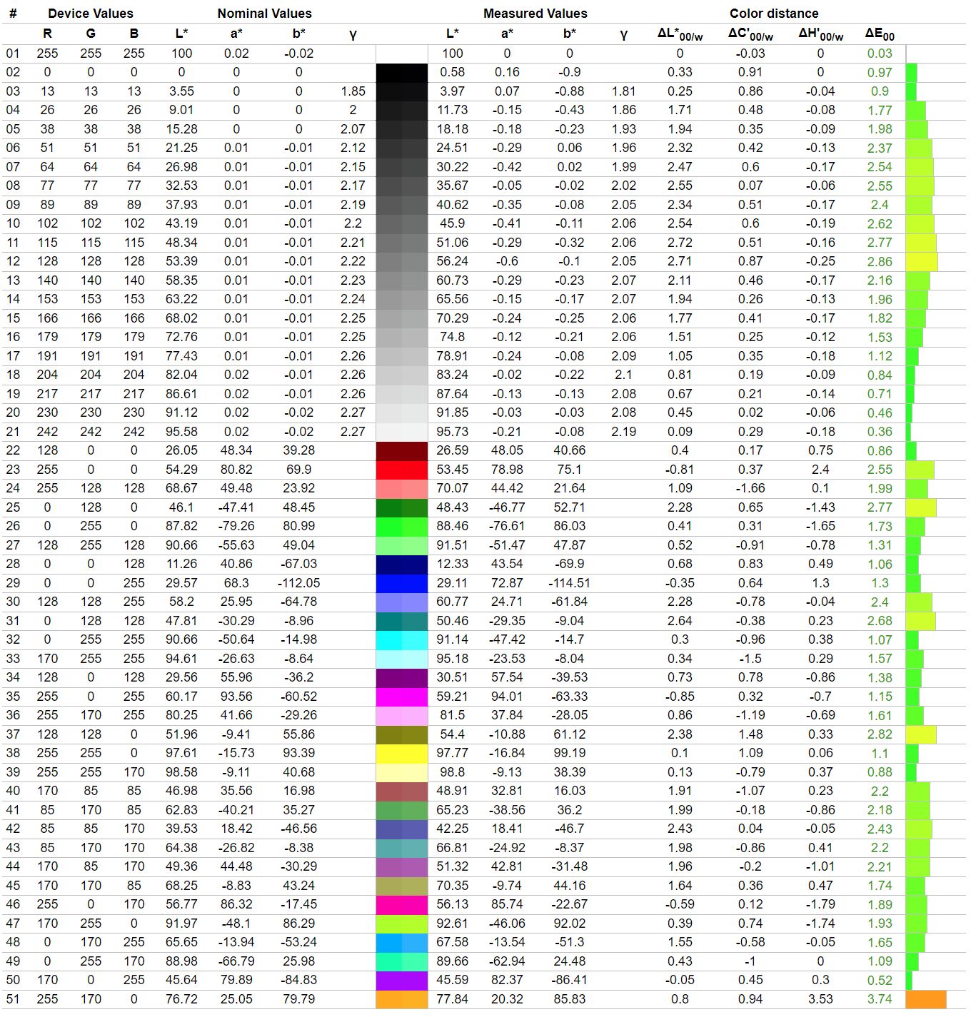 Fabryczną kalibrację można relatywnie łatwo poprawić, choć nieco mija się to z celem w tym przypadku. Taki zabieg wyraźnie obniża średni błąd Delta E do poziomu 0,48, który powinien zadowolić najbardziej wymagających profesjonalistów, ale trzeba pamiętać, że monitor oferuje tylko 8-bitową matrycę, więc schodkowanie pomiędzy odcieniami będzie dawać się we znaki - podobnie zresztą jak mała przestrzeń robocza (Full HD).