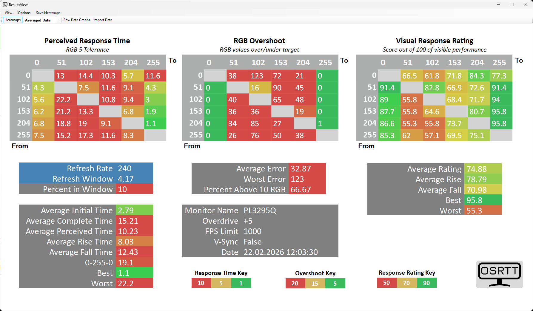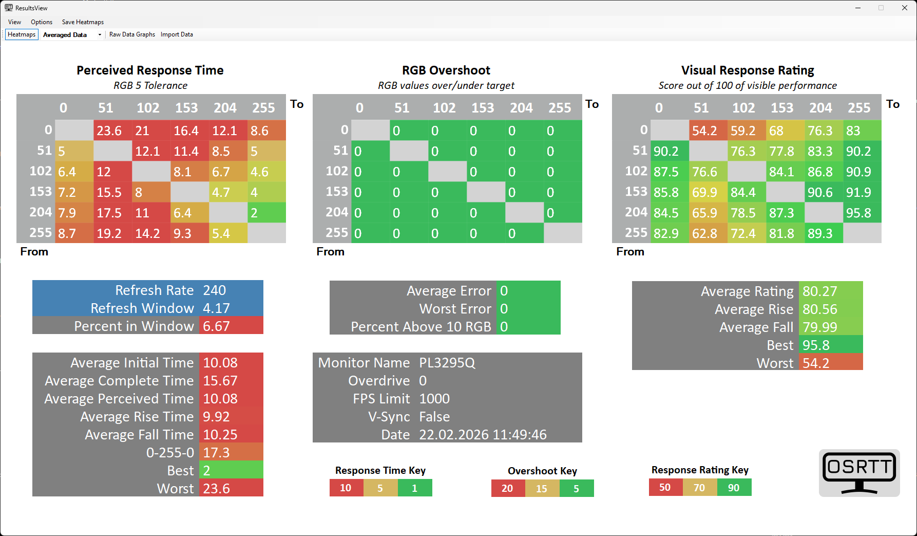 Fabrycznie monitor ma ustawioną luminancję na nietypową wartość 37%, co przekłada się na wysoką jasność bieli 188,8 cd/m² cd/m² dla bieli, a także 0,0453 cd/m² dla czerni, co daje wysoki kontrast na poziomie ok. 4171,7:1 (producent deklaruje 4000:1, więc jest nawet lepiej, a matryce VA oferują przeważnie 3000:1). W tym aspekcie panele VA mają dużą przewagę nad IPS-ami i tylko OLED-y zapewniają wyższy kontrast (praktycznie nieskończony). Temperatura kolorów domyślnie jest ustawiona praktycznie w punkt, bo 6584 K (neutralna wartość to 6500 K), przez co biel nie wpada w żółte i niebieskie odcienie. Naprawdę nieźle wypada też fabryczna kalibracja kolorów, bo średni błąd Delta E dla sRGB wynosi tylko 2,26 (maks. 6,54), a w przypadku DCI-P3 jest jeszcze lepiej, bo średni błąd to tylko 1,86 (maks. 4,47). Uznaje się, że błędy powyżej 3 są widoczne "na oko", więc GB3295QSU-B1 nie potrzebuje dużej korekty. Przyczepić można się za to do przebiegu gammy lokalnej, gdyż odnotowane wartości w pierwszej połowie są nieco zawyżone, co przekłada się na intensyfikację cieni.