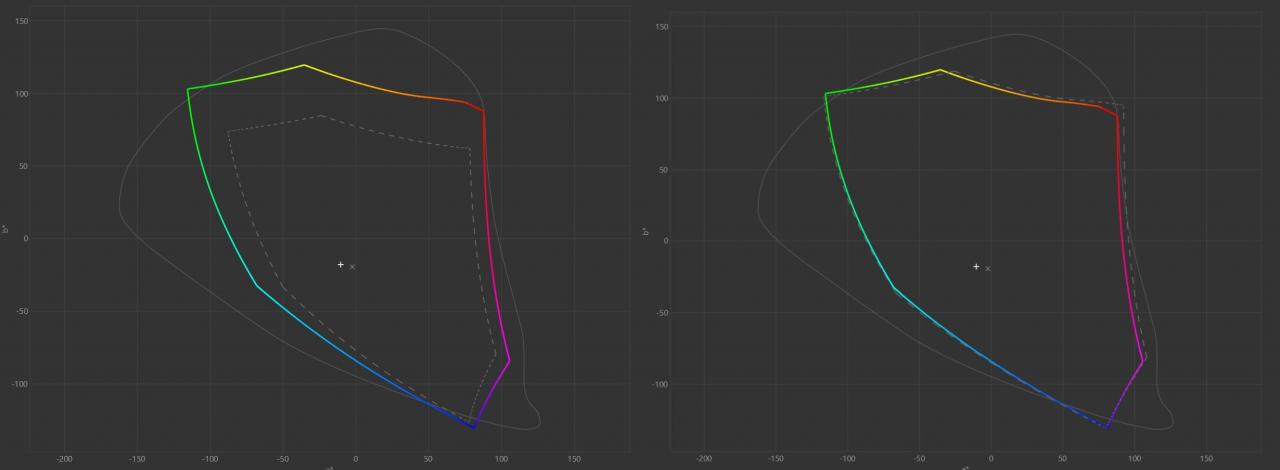 Z lewej pokrycie gamutu SRGB, z prawej DCI-P3