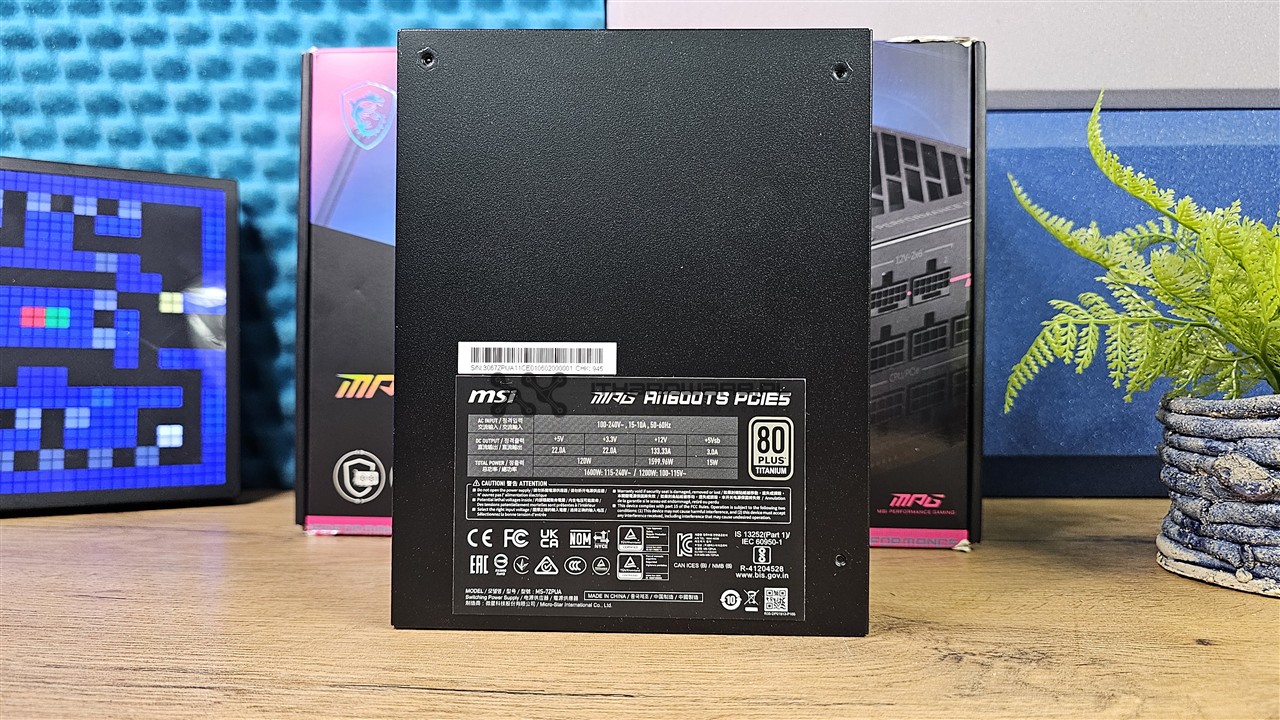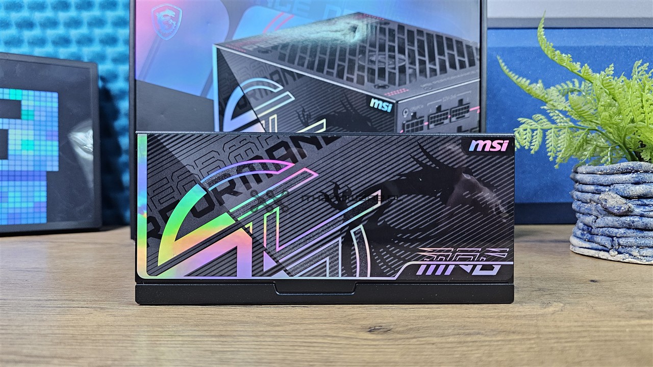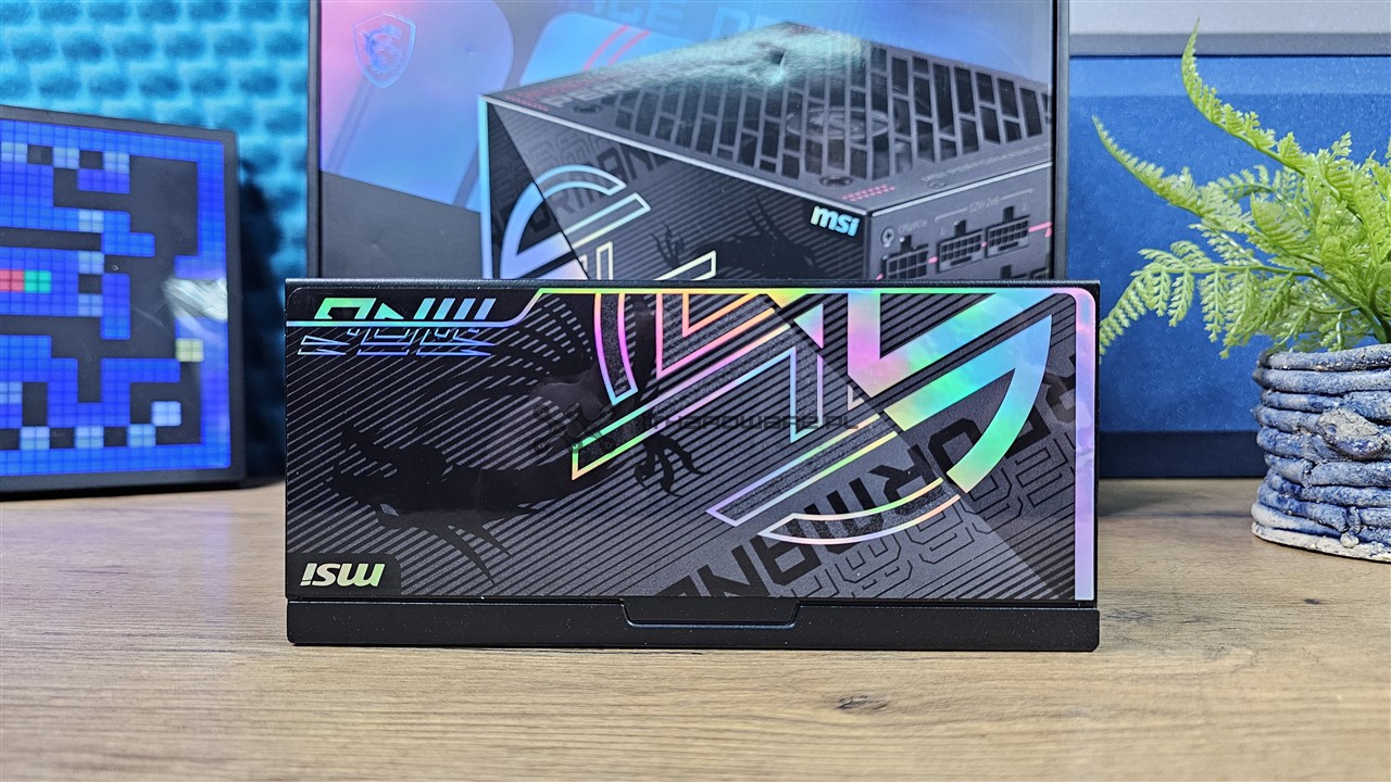 MSI MPG Ai1600TS PCIE5 to duża jednostka o wymiarach 190 x 150 x 86 mm. Powłoka lakiernicza jest dobrej jakości, a stylistyka obudowy wyraźnie nawiązuje do gamingowej linii MPG. Górną część zasilacza wypełnia duży grill wentylatora o charakterystycznym, agresywnym wzorze, pod którym pracuje 135 mm wentylator. Producent postawił na nowoczesne wzornictwo z różowymi akcentami oraz wyraźnymi napisami MSI Performance Gaming i Performance.
