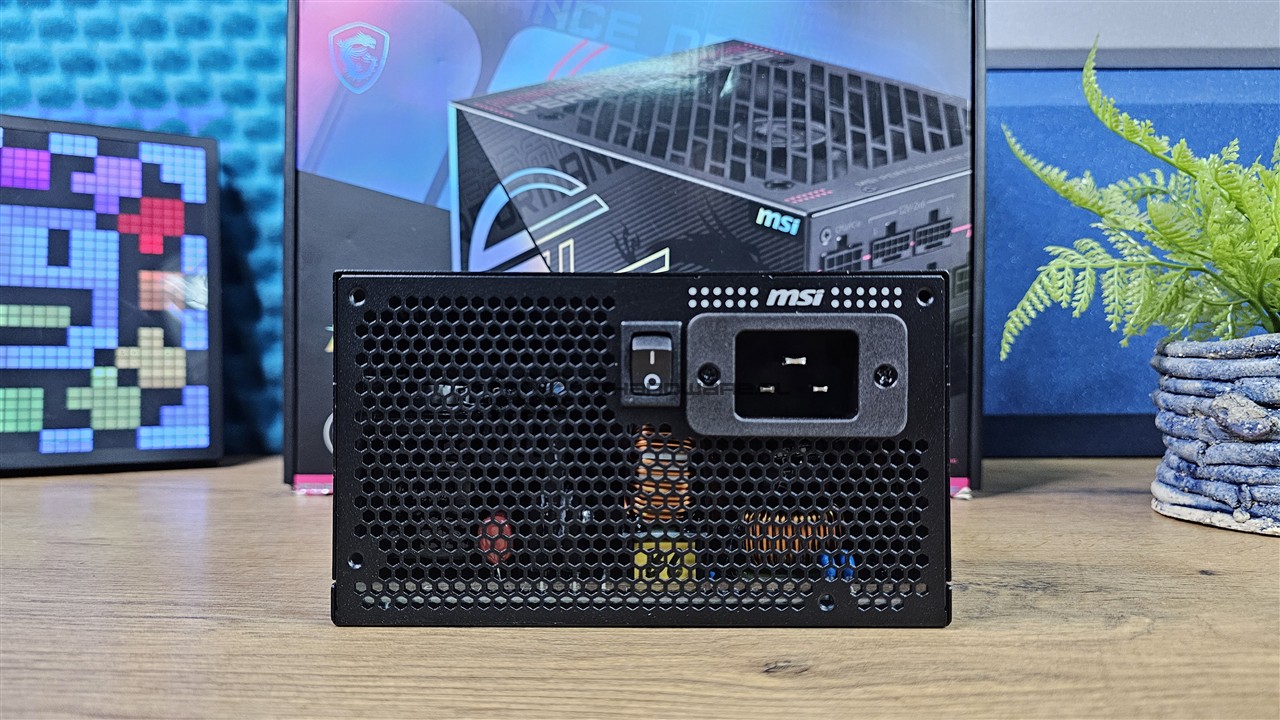 Tył zasilacza wykonano z blachy z perforacją w kształcie rozciągniętego plastra miodu, która odpowiada za odprowadzanie powietrza z wnętrza jednostki. Znajdziemy tutaj klasyczny włącznik zasilania oraz gniazdo zasilające w standardzie IEC320 C20 (16 A), stosowane w jednostkach o bardzo wysokiej mocy.