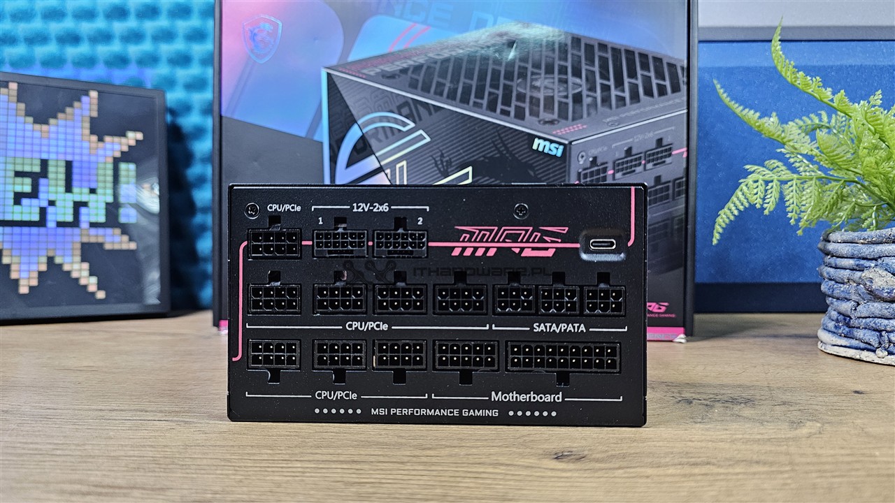 Na panelu modularnym rozmieszczenie gniazd jest czytelne i dobrze opisane, więc wiadomo, gdzie podłączyć dany przewód. Oczywiście nie zabrakło dwóch złączy dla kabli PCIe 5.1 12V-2x6 600 W, siedmiu gniazd dla klasycznych przewodów PCI-E oraz złączy dla przewodów SATA/PATA i płyty głównej. Warto zwrócić uwagę również na obecność portu USB typu C, który służy do komunikacji zasilacza z płytą główną i umożliwia monitoring parametrów pracy w aplikacjach MSI.