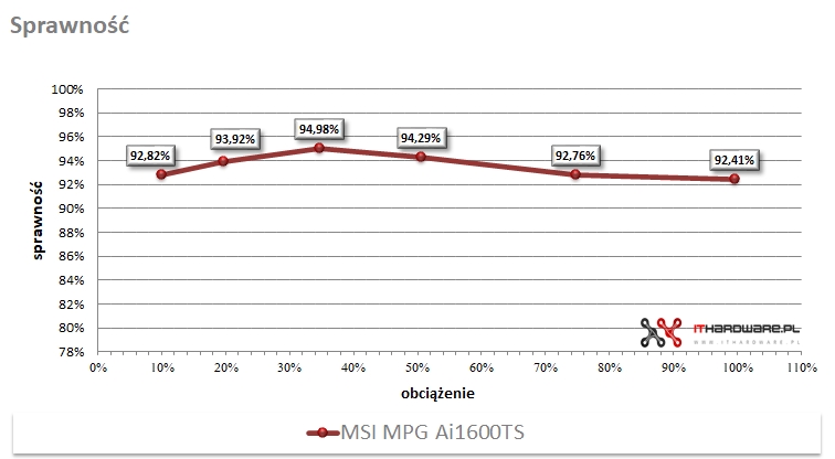 W standardowym zakresie obciążeń, od około 10% do 110% mocy znamionowej, zasilacz MSI MPG Ai1600TS osiąga najwyższą sprawność przy obciążeniu zbliżonym do 35%–50% (T3–T4), gdzie wyniosła ona odpowiednio 94,98% oraz 94,29%. W przedziale od około 20% do 75% mocy znamionowej sprawność utrzymywała się na poziomie 92,76%–94,98%. Przy obciążeniu znamionowym (T6) sprawność wyniosła 92,41%, natomiast w teście przeciążeniowym (110%) spadła do 90,99% przy mocy oddanej 1749,7 W.