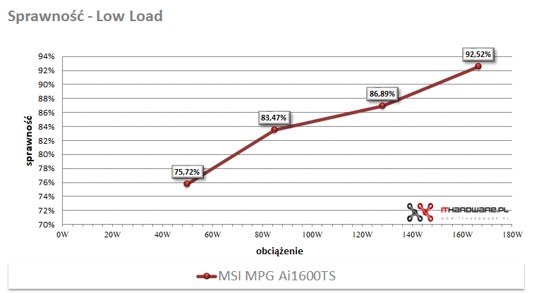 W testach niskiego obciążenia sprawność MSI MPG Ai1600TS rozpoczynała się od 75,72% przy około 3,12% obciążenia (LP1), by wzrosnąć do 92,52% przy obciążeniu wynoszącym 10,41% (LP4). Charakterystyka sprawności przy niskich obciążeniach jest bardzo dobra jak na jednostkę o tak wysokiej mocy znamionowej i pokazuje, że zasilacz dobrze radzi sobie również w bardziej energooszczędnych scenariuszach pracy.