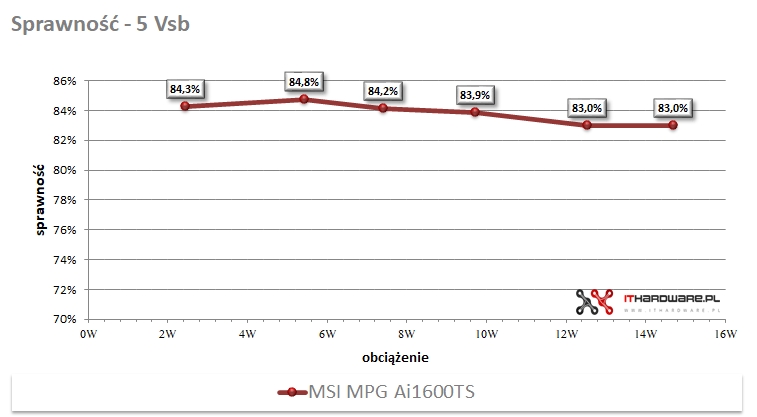 W zakresie linii pomocniczej +5 VSB zasilacz MSI MPG Ai1600TS osiągał sprawność od 83,0% (T5, T6) do 84,8% (T2), przy napięciu mieszczącym się w zakresie 4,946–4,987 V.