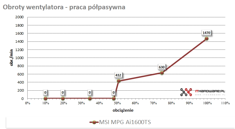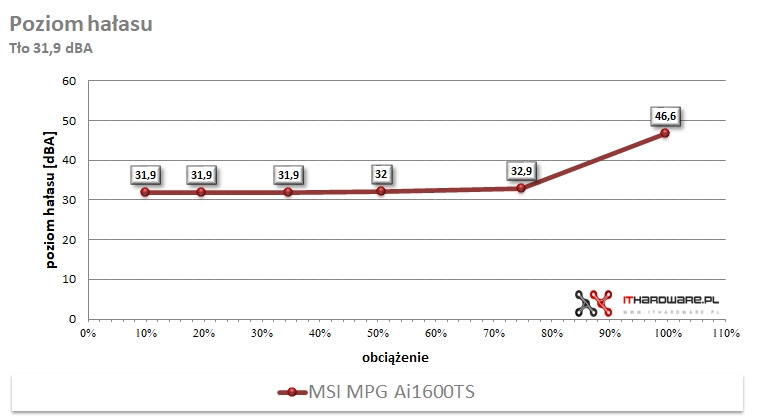 W szerokim zakresie obciążeń kultura pracy MSI MPG Ai1600TS stoi na bardzo dobrym poziomie. Do około 50% obciążenia wentylator pozostaje wyłączony (tryb półpasywny), a poziom hałasu utrzymuje się na stałym poziomie 31,9 dBA. Powyżej tej wartości charakterystyka zaczyna się zmieniać – przy 50,68% wentylator uruchomił się z prędkością 432 obr./min, generując około 32 dBA. Przy obciążeniu 74,79% prędkość wzrosła do 630 obr./min, a hałas do 32,9 dBA. W okolicach pełnego obciążenia (99,63%) wentylator osiągał 1470 obr./min i 46,6 dBA, natomiast przy 109,36% odnotowałem 1916 obr./min oraz 53,9 dBA. Przy maksymalnym przeciążeniu (116,03%) prędkość wzrosła do 2185 obr./min.