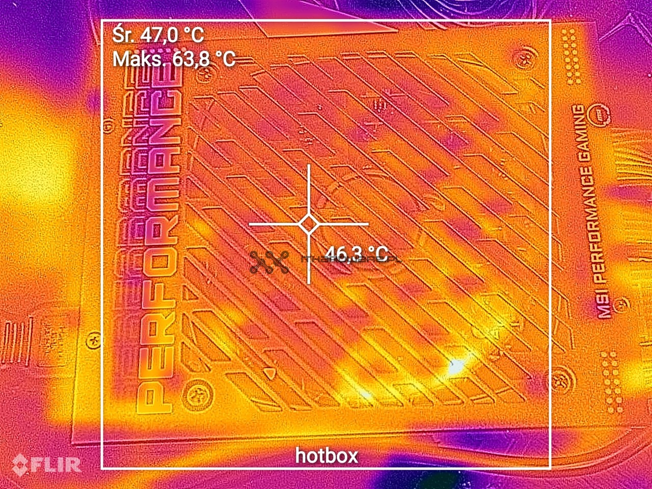 Pod pełnym obciążeniem maksymalna temperatura od strony wentylatora wyniosła 50,2 °C, natomiast na obudowie 70,7 °C. W warunkach hot box odnotowano wyższe wartości – 63,8 °C na stronie wentylatora i 79,9 °C na spodzie obudowy.