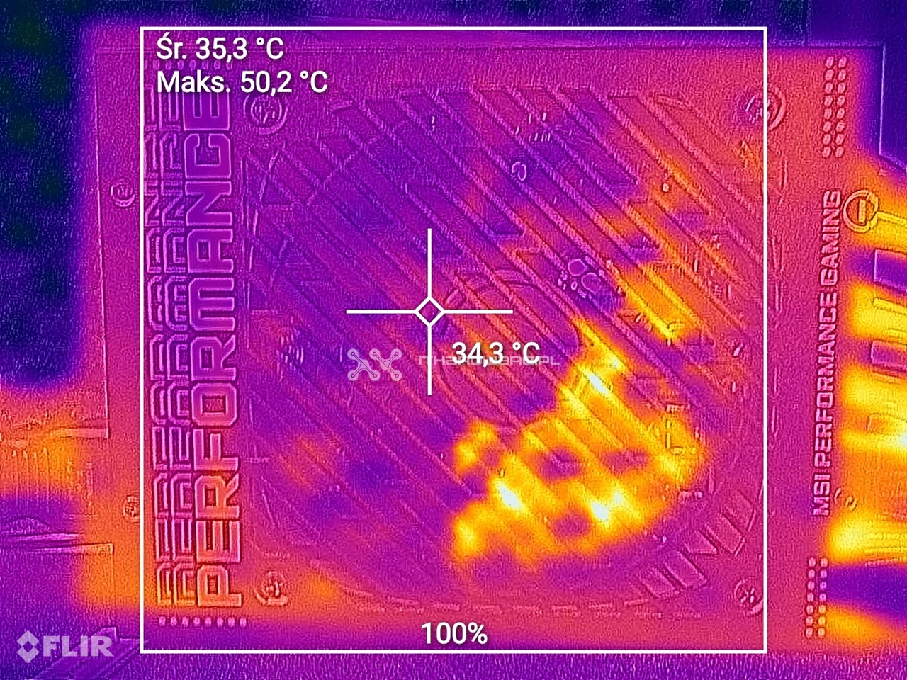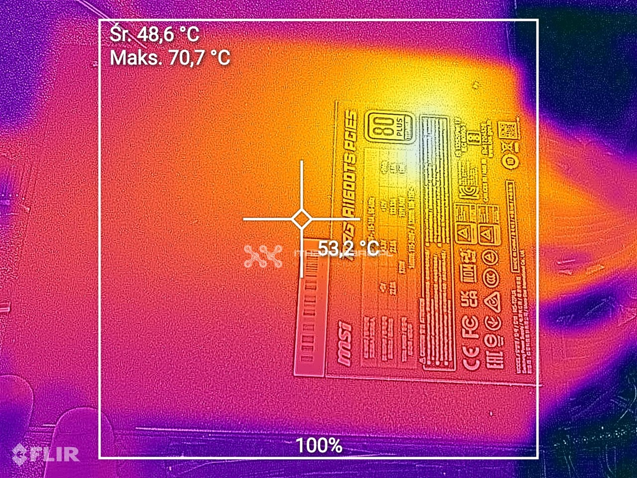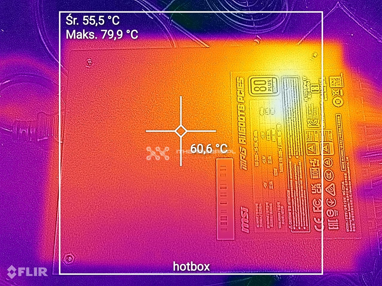 Kamera termowizyjna zainstalowana w uleFone Armor 9 pozwala na badanie wielu punktów jednocześnie, wykorzystując wiele różnych filtrów. Wykonałem kilka zdjęć od strony wentylatora oraz od spodu PSU, w dwóch scenariuszach - na obciążeniu 100% oraz zaraz po wyłączeniu PSU, po teście w hot boxie. Taka analiza może uzewnętrznić wady konstrukcyjne, potencjalne miejsca oszczędności, jak na przykład zbyt słabe tranzystory, które się przegrzewają i osiągają bardzo wysokie temperatury, czy zastosowanie niewystarczającego systemu chłodzenia elektroniki.