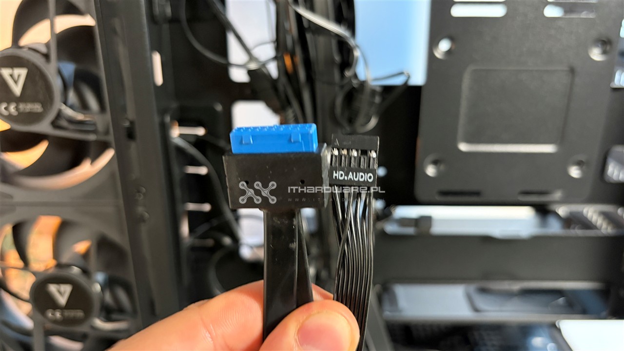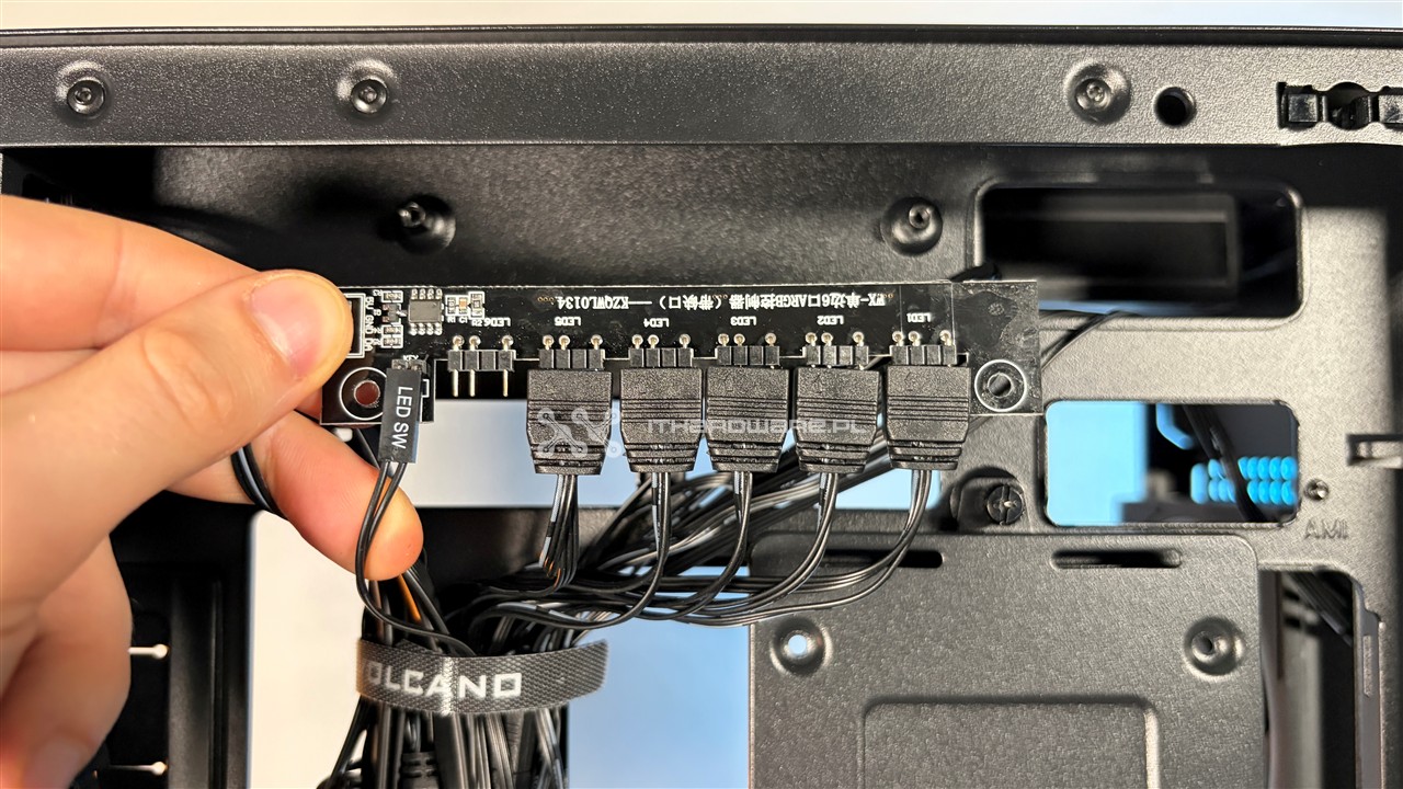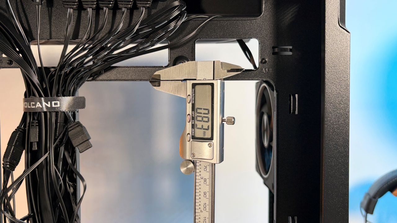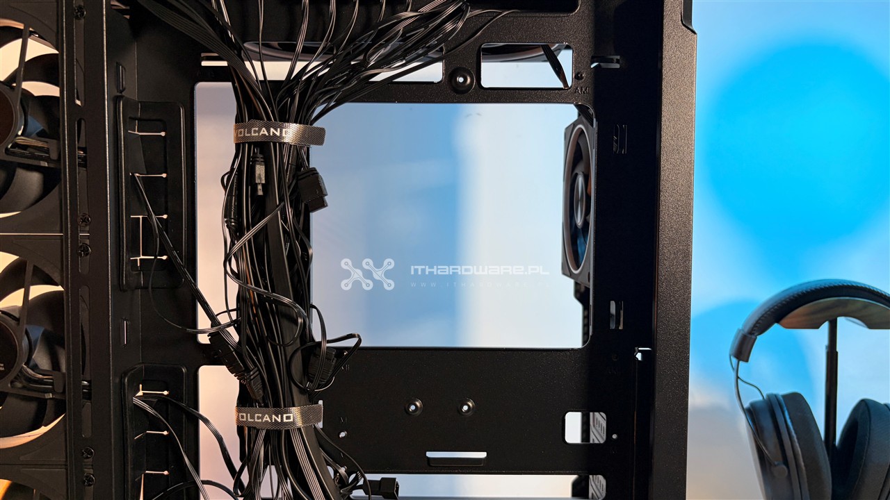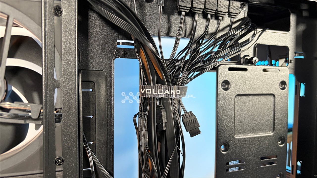 Domeną obudów wyposażonych w kilka podświetlanych wentylatorów jest duża ilość przewodów. I nie inaczej jest w tym przypadku. Dzięki dołączanym opaskom rzepowym można to jednak łatwo pospinać. Cable management ułatwia również spora ilość miejsca na przewody. Według pomiaru to około 38 mm. Grubość blachy w naszym standardowym miejscu pomiarowym to z kolei ok. 0,83 mm.