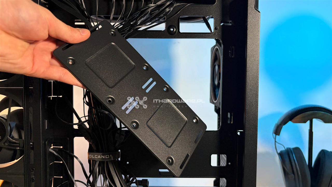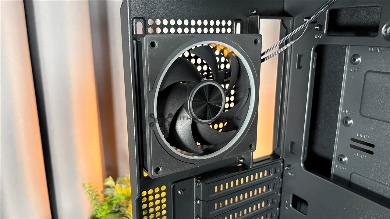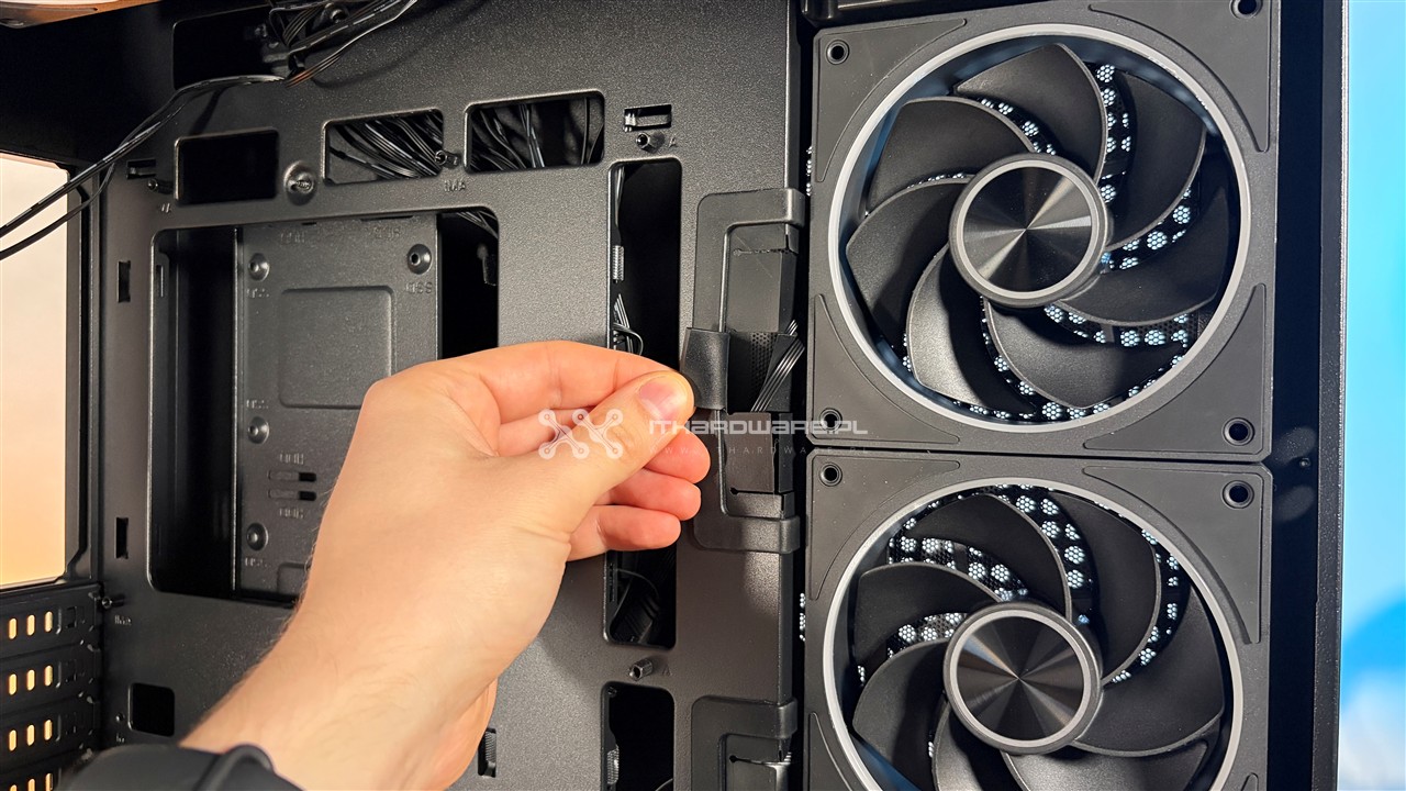 Otworów pełniących rolę przepustów na okablowanie jest tutaj dużo. Mają one prawidłowe rozmiary, a wiele z nich posiada gumowe osłonki. Nie zabrakło też dedykowanego przepustu dla kabla zasilającego kartę graficzną. Miło. Poza tym główna komora skrywa klatkę dysków, do której przytwierdzony jest wentylator. Co ważne można go stąd zdemontować (podobnie jak samą klatkę) oraz regulować jego kąt nachylenia przy pomocy jednej szybkośrubki.