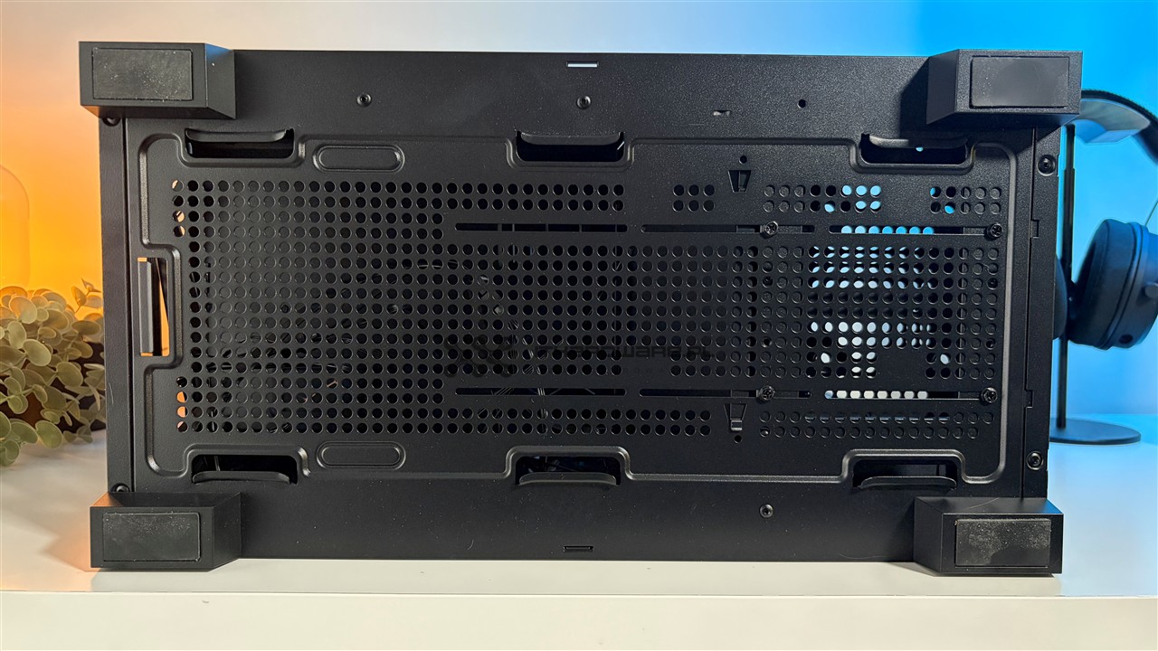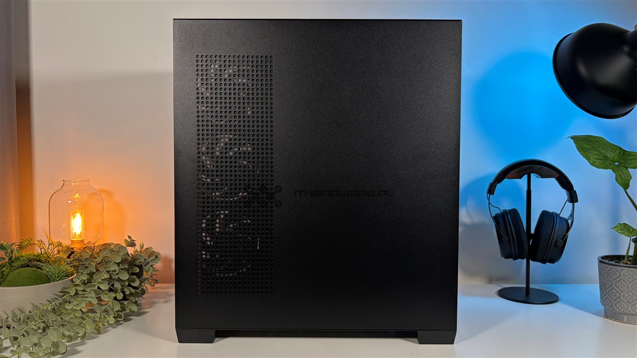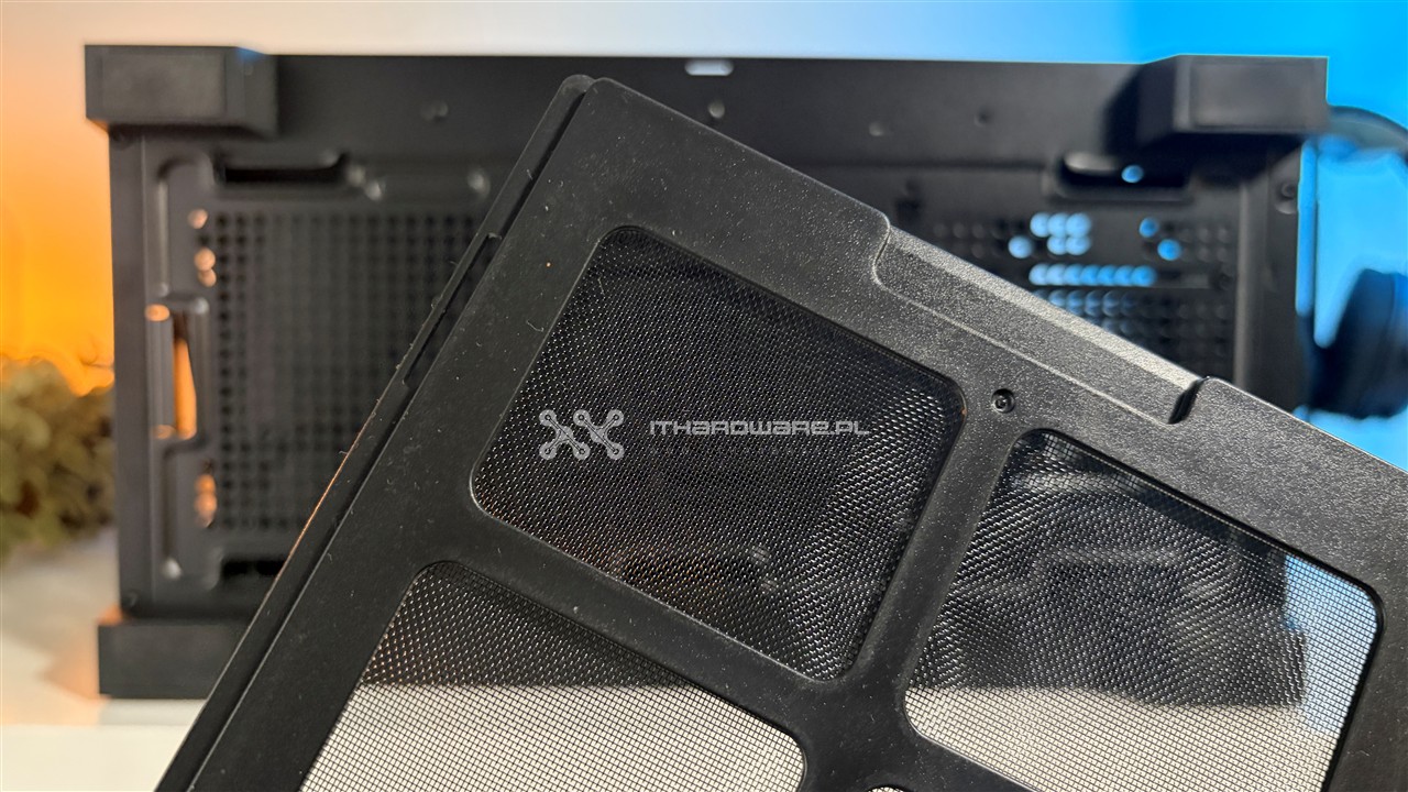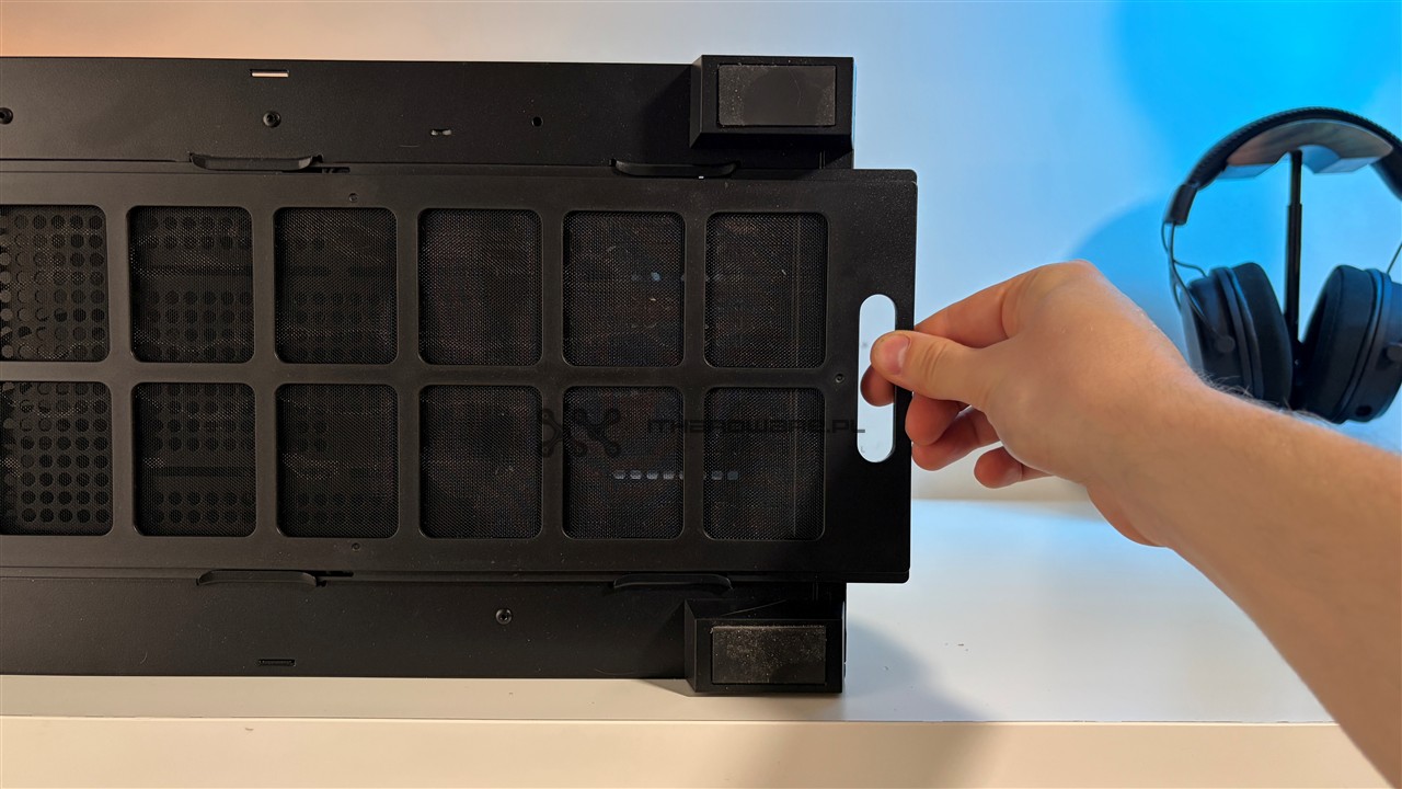 Jako że mówimy o obudowie typu „akwarium” to nie dziwi mnie kompletnie perforacja na drugim z paneli bocznych. To właśnie dzięki tym otworom wentylacyjnym chłodne powietrze może być zaciągane przez wentylatory zlokalizowane na boku. Co ważne, otwory wentylacyjne tego panelu są chronione filtrem mocowanym przy pomocy magnesów.