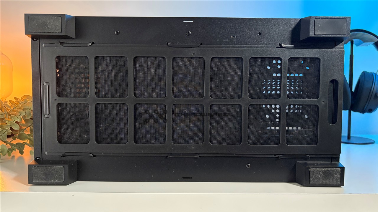 Obok części z portami i przyciskami znajduje się dużych rozmiarów filtr przeciwkurzowy. Jego mocowanie zostało zrealizowane klasycznym już sposobem - za pomocą magnesów. Pod spodem znajdziemy natomiast ramkę pozwalającą zamontować wentylatory lub radiator chłodzenia cieczą. Krótko mówiąc to standardowa budowa góry, podobna do wielu innych modeli.