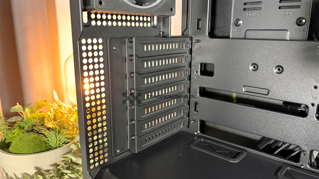Zaślepki slotów rozszerzeń są tutaj wentylowane i wykręcane. Warto jeszcze raz zaznaczyć, że Modecom umożliwił zmianę ich położenia, tym samym pozwalając na pionowy montaż karty graficznej. I w zasadzie tym akcentem kończymy z komorą główną i przenosimy się na tył obudowy - za ściankę płyty głównej.