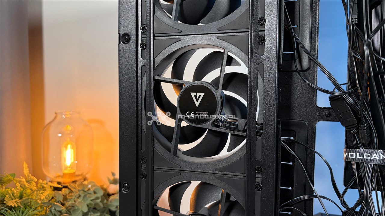 Fabryczny system chłodzenia jest tutaj bardzo rozbudowany. Bo jak inaczej nazwać obecność aż ośmiu wentylatorów 120 mm? Można powiedzieć, że każdy z nich to ten sam model. Z tym, że trzy sztuki zamontowane na boku posiadają odwrócone łopatki, dzięki czemu mogą tłoczyć powietrze do środka, a nie je wypychać. Reszta posiada klasyczne ułożenie łopatek.