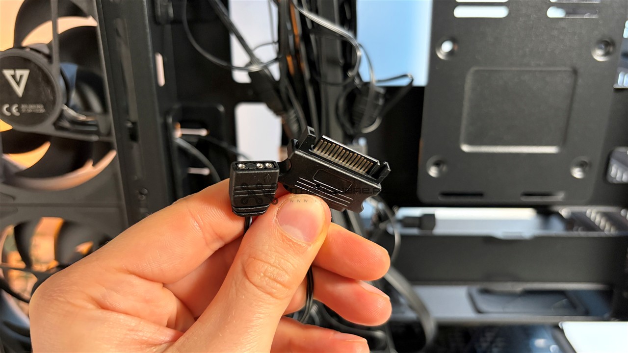 Co ważne, za ścianką płyty głównej znalazł się kontroler podświetlenia zasilany złączem SATA. Możemy do niego podłączyć 2-pinowy przewód idący od przycisku RESET/LED na górze obudowy i za jego pomocą zmieniać tryby. Istnieje także opcja podłączenia do płyty głównej wyposażonej w odpowiednie złącze ARGB i sterowania podświetleniem za pomocą aplikacji. Kontroler posiada pamięć ustawień i pozwala także na wyłączenie podświetlenia przez 5-sekundowe naciśnięcie i przytrzymanie przycisku.