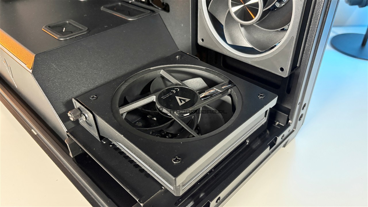 Sama konstrukcja wnętrza tej obudowy - pomijając ilość wentylatorów - nie zaskakuje. Mamy tutaj klasyczny dwukomorowy schemat, z tym że osłona zsilacza została dodatkowo ścięta. Ten zabieg prawdopodobnie jest bezpośrednio związany z wentylatorem zamontowanym na klatce dysku, którego zadaniem jest dmuchać pod kartę graficzną. Ścięcie osłony zasilacza sprawia, że powietrze to nie jest aż tak blokowane.