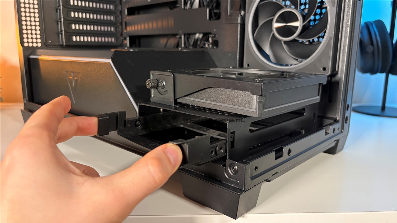 Zostając jeszcze w temacie dysków, producent umożliwił montaż do trzech sztuk w rozmiarze 3,5 cala i do czterech dysków 2,5-calowych. Oprócz klatki w komorze głównej ich miejsce montażu znajduje się także z tyłu, na specjalnej demontowalnej ściance za płytą główną.