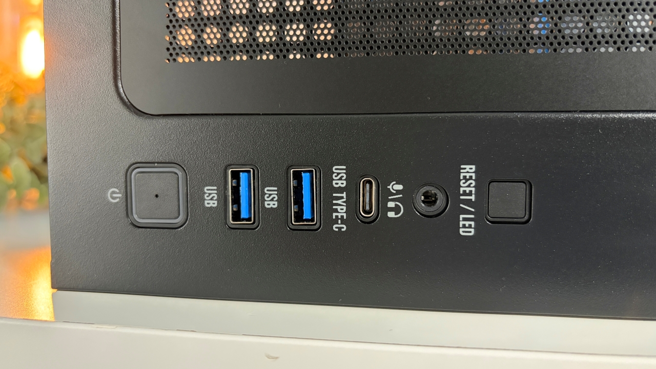 Sekcję portów otwierają nam dwie sztuki USB 3.0 typu A oraz pojedyncze USB-C 3.2 Gen. 2. Zaraz obok znajdziemy też złącze combo jack dla słuchawek i mikrofonu, przycisk power i drugi przycisk mogący pełnić funkcję reset, jak i sterowania podświetleniem. Prawdę mówiąc wolałbym tutaj widzieć dwa osobne „guziki” do restartowania komputera i zmiany trybu LED.