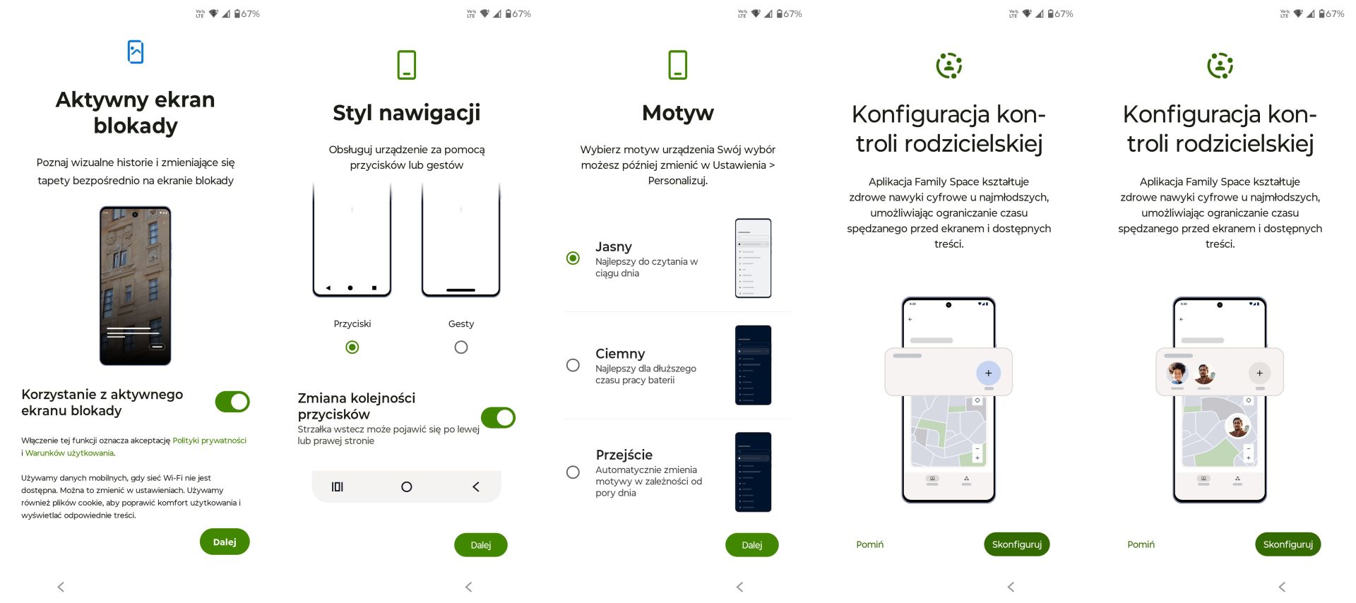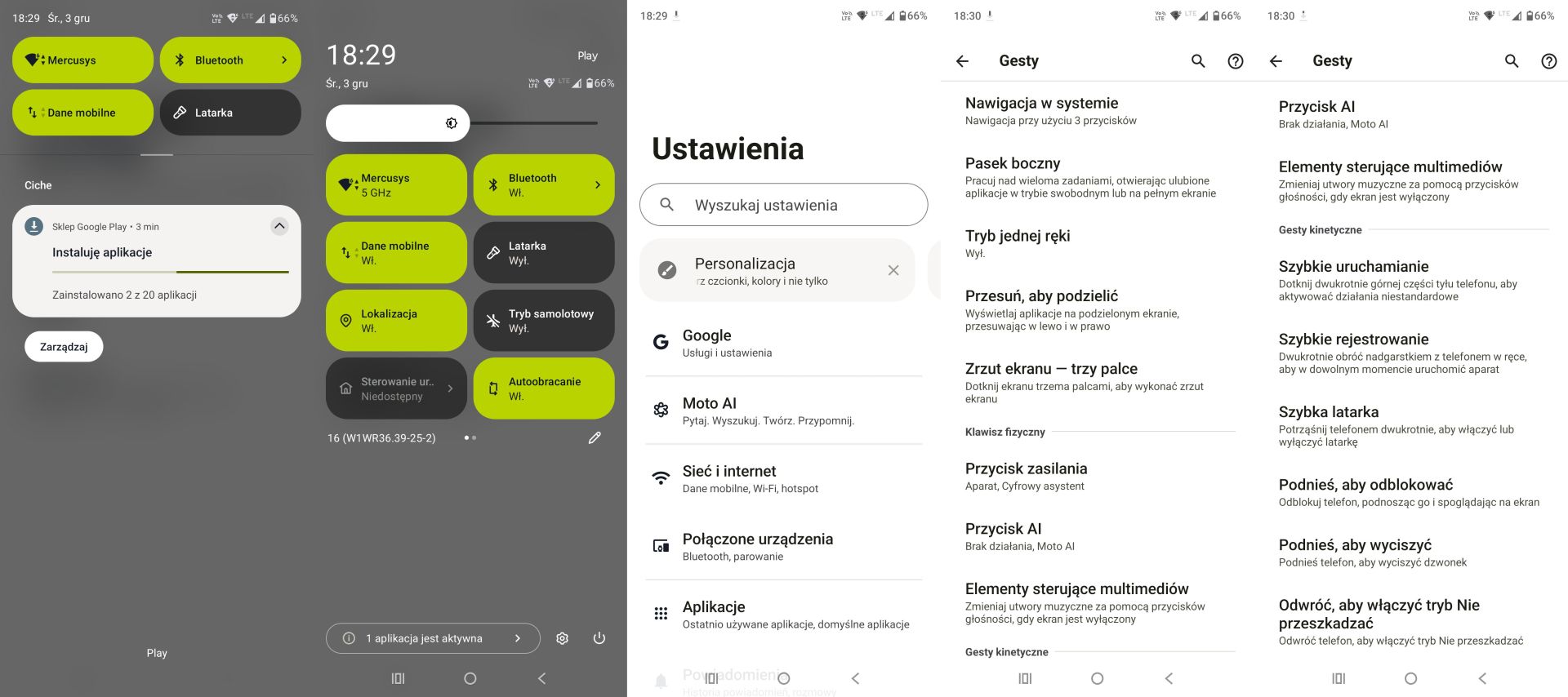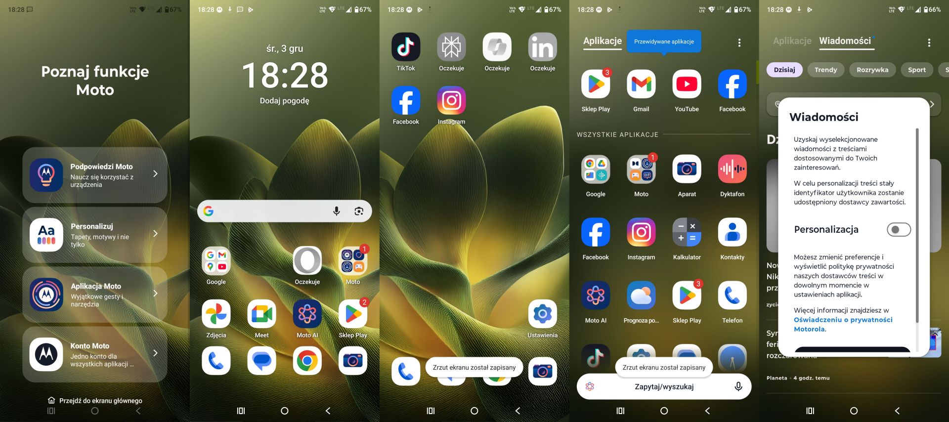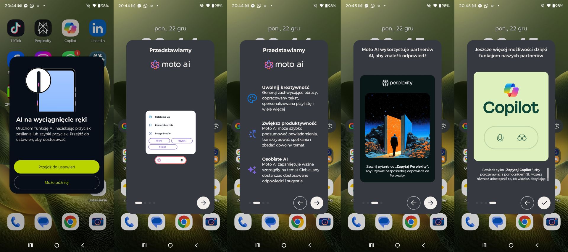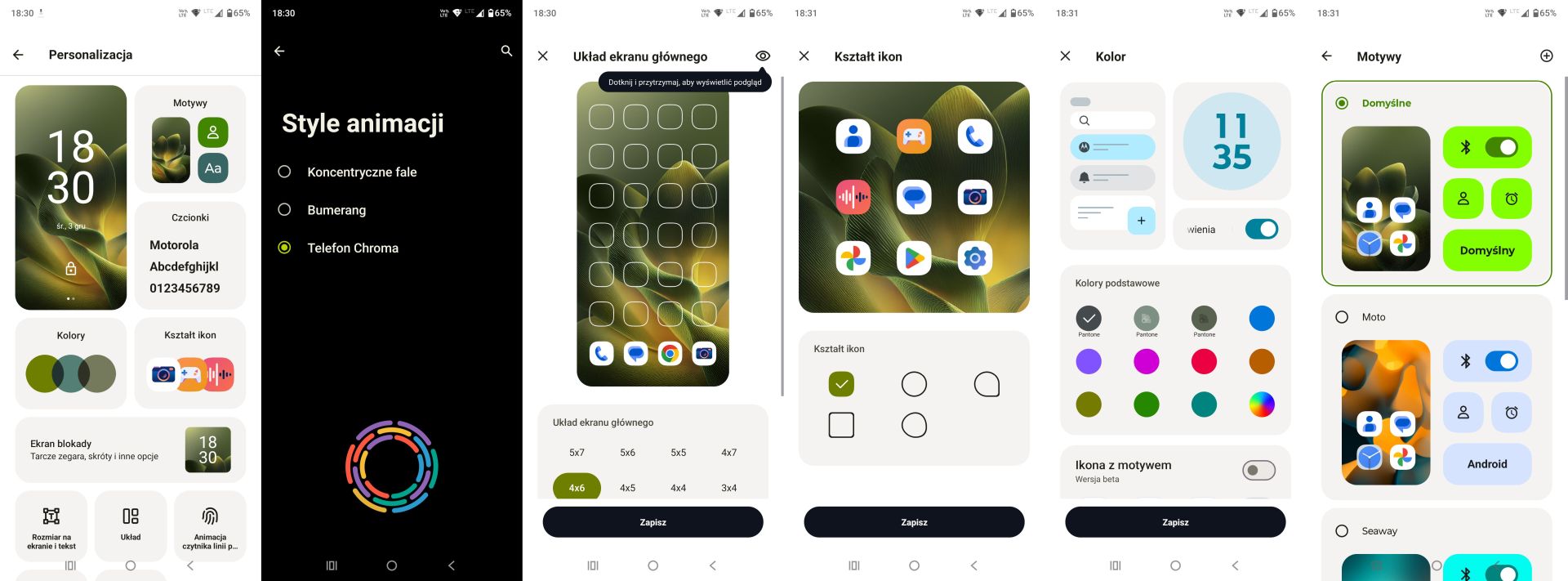 Jeżeli zaś chodzi o samo Hello UI, to każdy użytkownik motoroli poczuje się tu jak w domu, bo dostajemy znane i lubiane gesty (podzielone na ekranowe i kinetyczne, m.in. potrząsanie, by włączyć latarkę czy szybkie dwukrotne dotknięcie górnej części plecków, by uruchomić przypisaną opcję, np. AI, dyktafon i inne), bogate opcje personalizacji (styl nawigacji, kolory, kształt ikon, czcionka, tapety, motywy, animacja czytnika linii papilarnych, podświetlane krawędzie), pakiet bezpieczeństwa Moto Secure (bezpieczny folder, kontrola prywatności, wykrywanie phishingu, mieszanie klawiatury PIN) czy Smart Connect, które zastąpiło funkcję Ready For.
