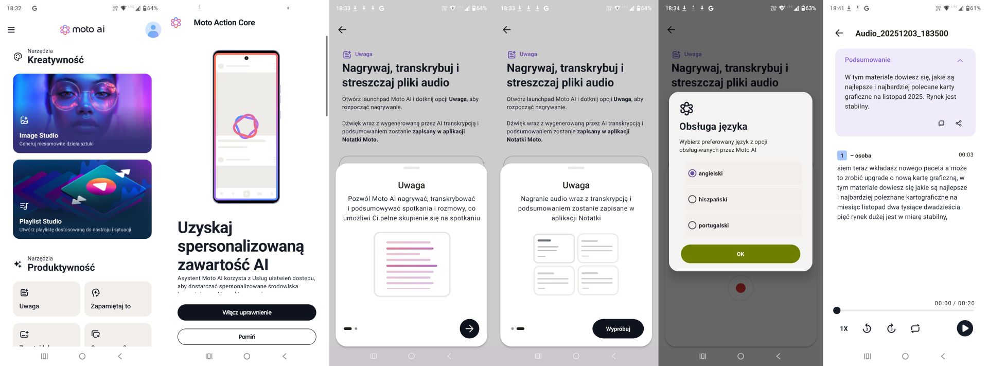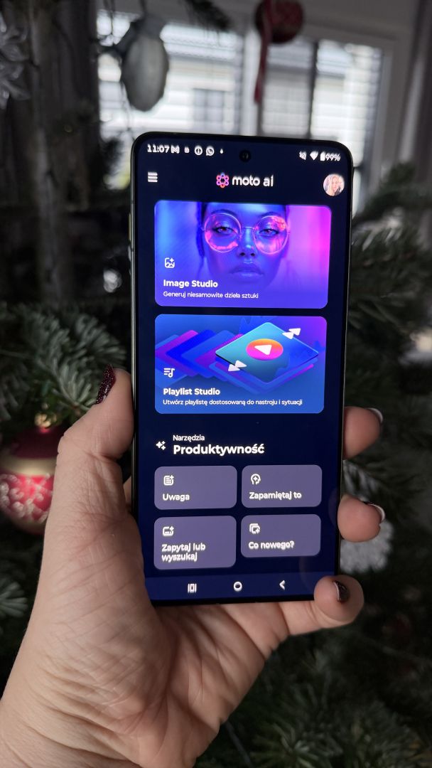 Mówiąc krótko, motorola w dużym stopniu stawia na to, co od lat cenią jej użytkownicy, a idąc z duchem czasu dodaje też opcje z zakresu sztucznej inteligencji, które zostały zebrane w Ustawieniach pod wspólnym szyldem Moto AI - ba, mamy nawet dedykowany jej przycisk na lewym boku. I tak, jest Image Studio, które pozwala tworzyć obrazy, tapety, naklejki czy awatary na podstawie naszych opisów; Playlist Studio do generowania playlisty do 10 utworów z Amazon Music, Uwaga, czyli opcje rejestracji, transkrypcji i tworzenia podsumowań oraz Zapamiętaj to, czyli możliwość "tworzenia wspomnień" (jak nazywa to producent, bo w praktyce raczej notatek-przypominajek, do których system może szybko wrócić w razie potrzeby. Nie zabrakło też Gemini czy Zakreśl, by wyszukać od Google, ale to akurat żadne zaskoczenie.