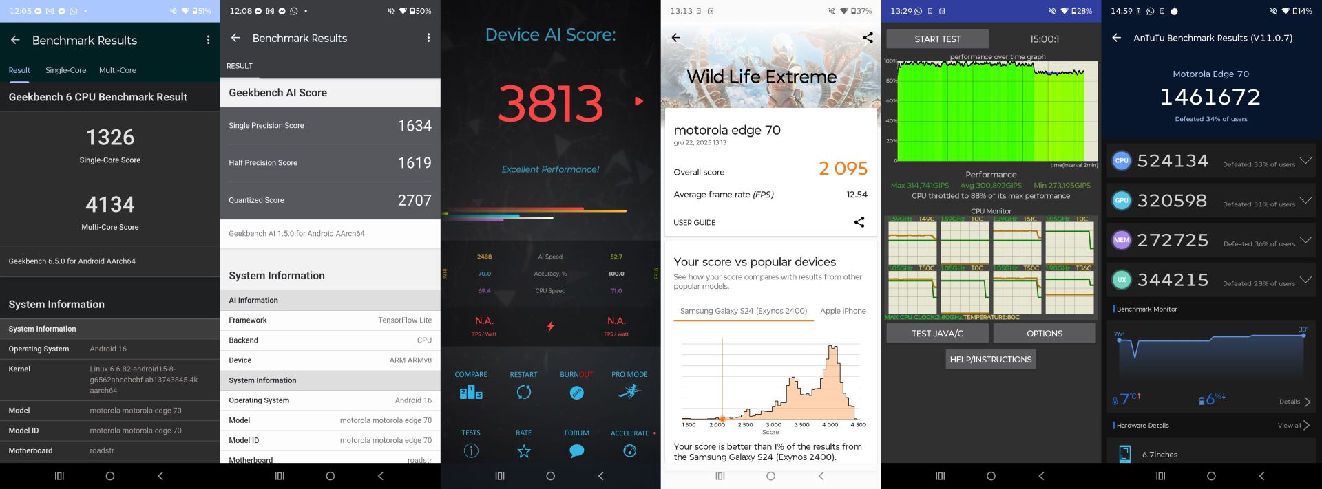Smartfony z kategorii ultrasmukłych nie mają w zwyczaju bić się o palmę pierwszeństwa w zakresie wydajności, ale jak przy każdym współczesnym smartfonie ważne jest, by działały płynnie, sprawnie uruchamiały aplikacje, nie ubijały ich w tle, pozwalały na sprawny multitasking i zapewniały odpowiednie zaplecze komunikacyjne. I motorola edge 70 może odhaczyć wszystkie te punkty, a zadbał o to produkowany w 4 nm procesie technologicznym 8-rdzeniowy układ Qualcomm Snapdragon 7 Gen 4 (1x Cortex-720 2.8 GHz, 4x Cortex-720 2.4 GHz, 3x Cortex-520 1.8 GHz ) z Adreno 722 wspomagany przez 12 GB pamięci RAM LPDDR5X i 512 GB pamięci na dane UFS 3.1, a konkretniej łączący je moduł uMCP. Jeśli zaś chodzi o opcje łączności, to mamy USB typu C (niestety USB 2.0), NFC, 5G (dual SIM - nanoSIM i eSIM), trzyzakresowe Wi-Fi 6e (802.11 a/b/g/n/ac/ax), Bluetooth 5.4, NFC oraz nawigację GPS, AGPS, LTEPP, SUPL, GLONASS i Galileo.