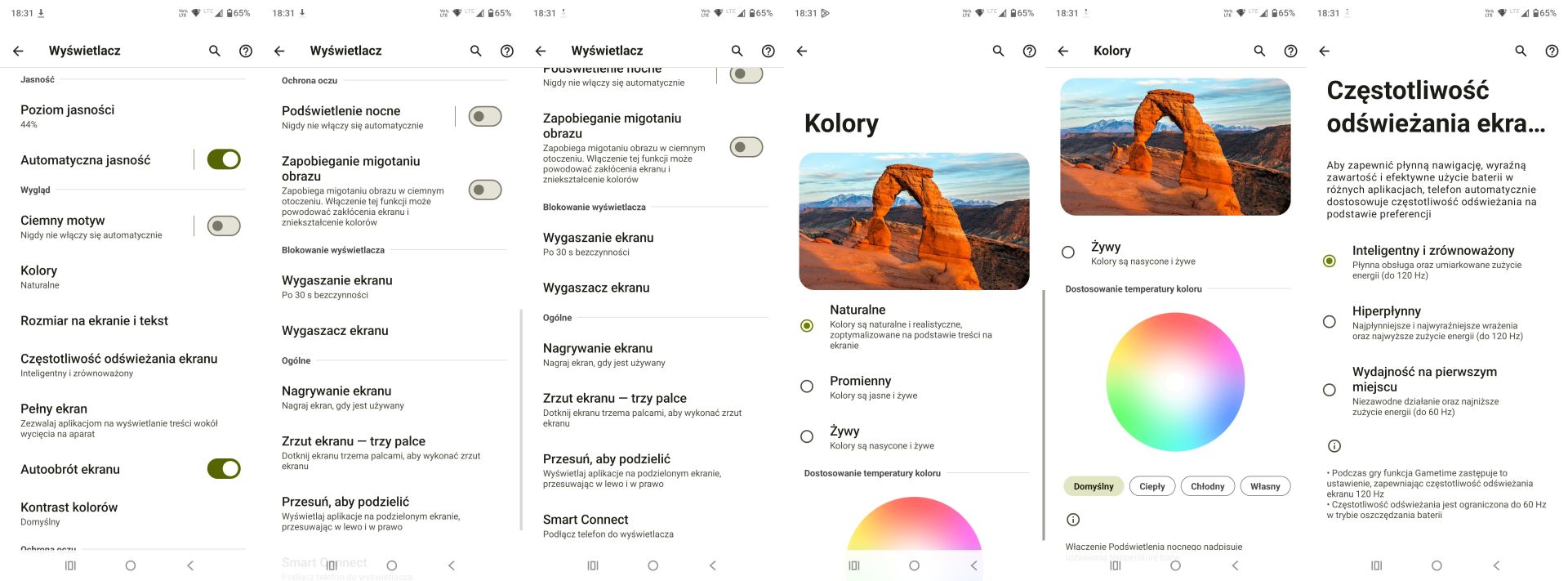 A co znajdziemy w ustawieniach smartfona? Możemy tu dopasować poziom jasności, zmienić tryb kolorów (naturalne, promienne, żywy - każdy z opcją zmiany temperatury kolorów), zmienić rozmiar czcionki i elementów na ekranie, włączyć jasność automatyczną, skorzystać z ciemnego motywu (manualnie albo harmonogram), włączyć podświetlenie nocne (manualnie albo harmonogram i intensywność) czy wybrać częstotliwość odświeżania (Inteligentny i zrównoważony, czyli automatyczne do 120 Hz, Hiperpłynny 120 Hz i Wydajność na pierwszym miejscu 60 Hz). To właśnie tu motorola zdecydowała się też umieścić ustawienia podziału ekranu, zrzutu ekranu czy opcję Smart Connect (Ready For po zmianie nazwy).