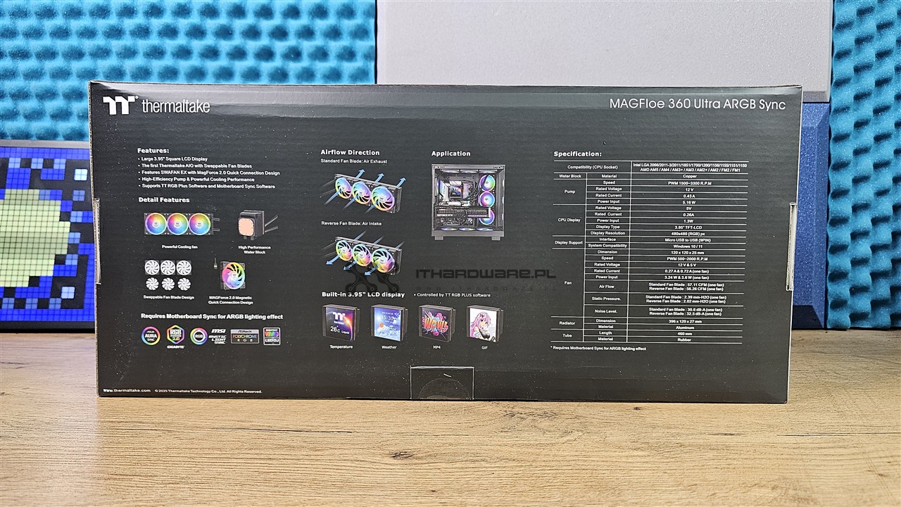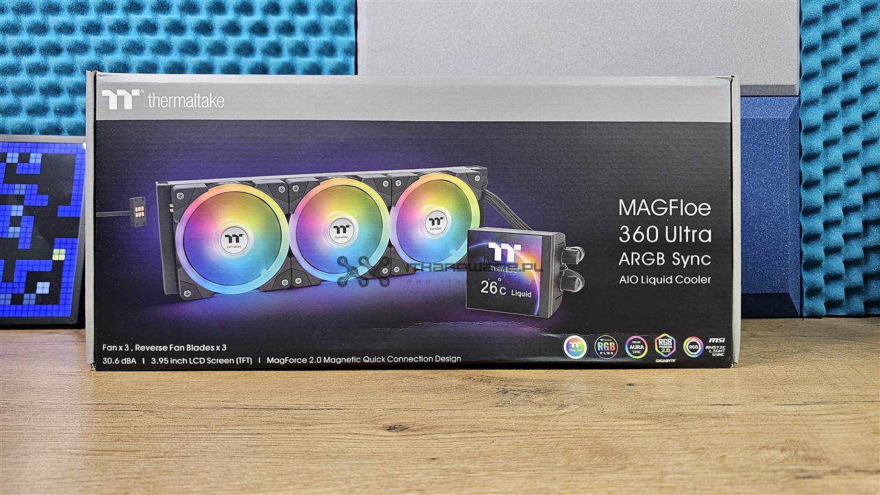 Thermaltake MAGFloe 360 Ultra ARGB Sync to chłodzenie cieczą typu AiO, które już na pierwszy rzut oka wyróżnia się na tle konkurencji. Producent postawił nie tylko na wysoką wydajność chłodzenia, ale również na mocno rozbudowaną warstwę wizualną – centralnym elementem zestawu jest duży, 3,95-calowy ekran TFT LCD umieszczony na bloku pompki, pozwalający na prezentację parametrów pracy systemu, pogody, godziny oraz własnych grafik i materiałów wideo. Całość uzupełniają chłodnica 360 mm o grubości 27 mm, pompka sterowana sygnałem PWM oraz zestaw wentylatorów SWAFAN EX ARGB Sync, które wyróżniają się systemem szybkiego łączenia MagForce 2.0 oraz wymiennymi łopatkami pozwalającymi zmieniać kierunek przepływu powietrza bez psucia efektu wizualnego. Istotnym elementem konstrukcji jest także rozbudowany ekosystem TT RGB PLUS 3.0 z funkcją AI Forge i aplikacją mobilną TT PlayLink, dzięki czemu MAGFloe 360 Ultra ARGB Sync celuje nie tylko w segment wydajnych zestawów chłodzenia, ale również w użytkowników oczekujących szerokich możliwości personalizacji. Pozostaje więc sprawdzić, jak ta efektowna forma przekłada się na realną funkcjonalność i potencjał całego układu.