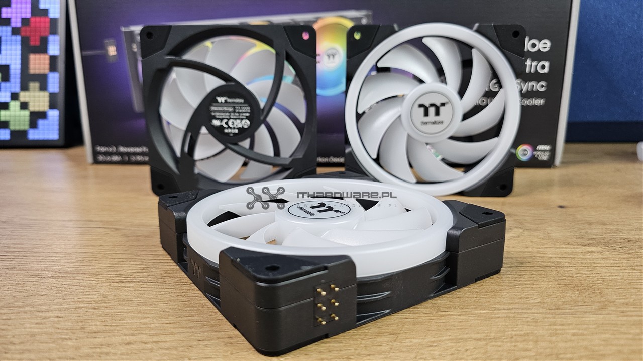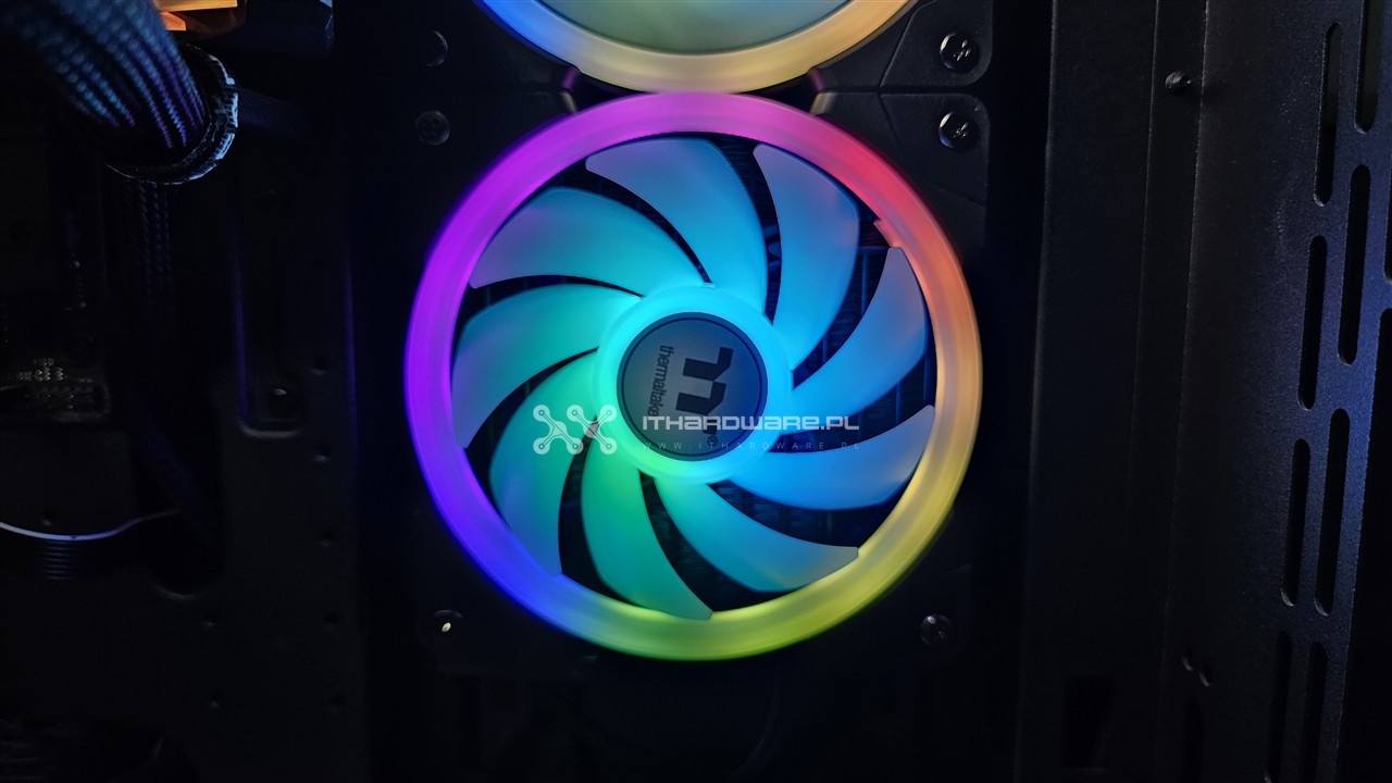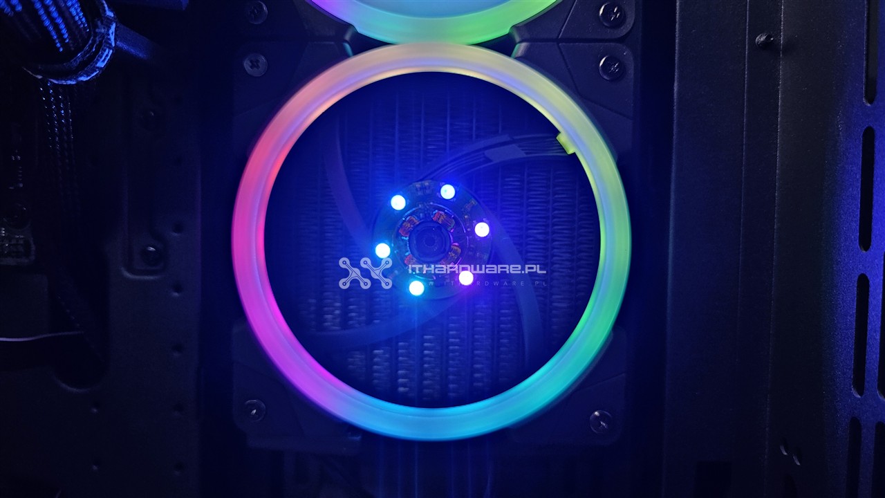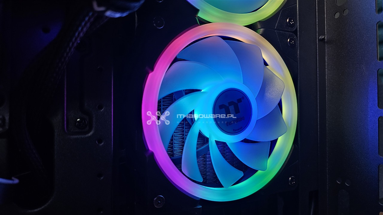 Same wentylatory wyposażono w podświetlenie ARGB w dwóch strefach – centralnej oraz w formie pierścienia wokół wirnika. Taka konstrukcja poprawia efekt wizualny, ale jednocześnie wymusza zastosowanie mniejszego wirnika o średnicy około 101,4 mm, co ma bezpośredni wpływ na wydajność. W przypadku zastosowania wirników typu reverse należy dodatkowo liczyć się z dalszym spadkiem efektywności – zarówno ze względu na ich konstrukcję, jak i fakt, że powietrze przepływa przez radiator w przeciwnym kierunku, co zwiększa opory przepływu.