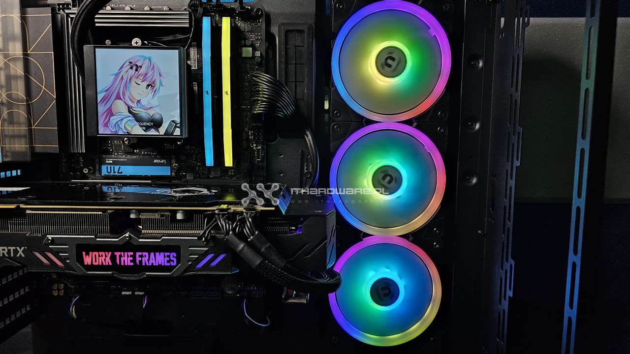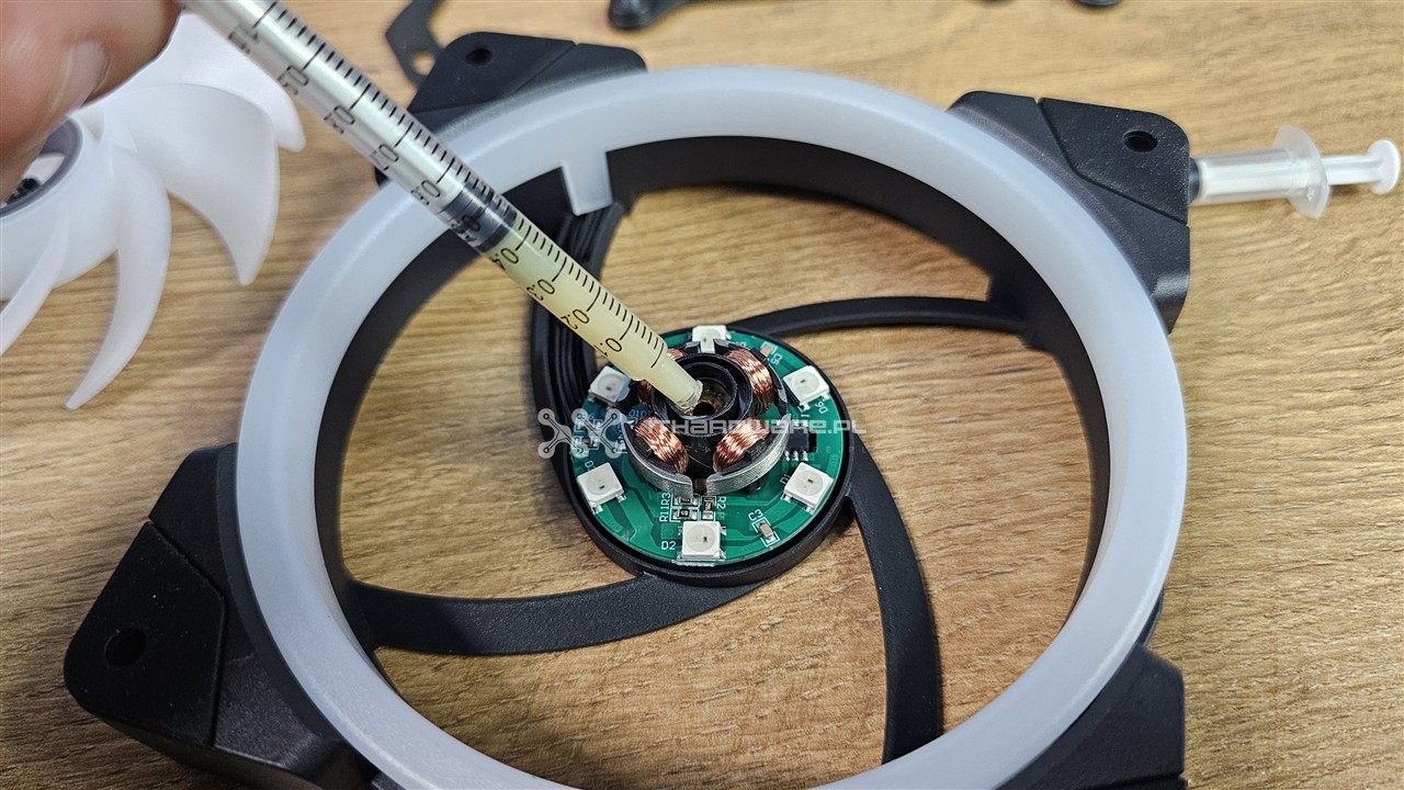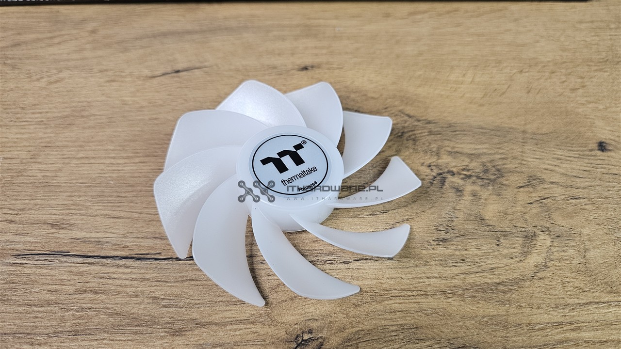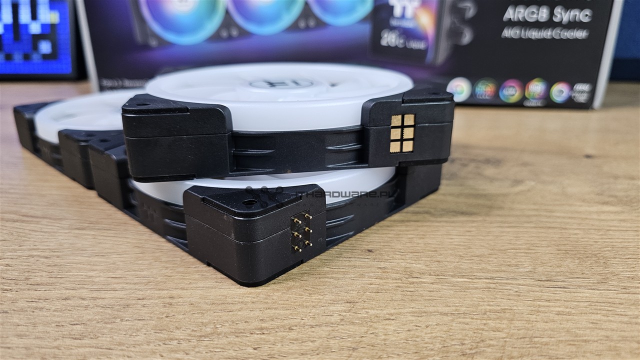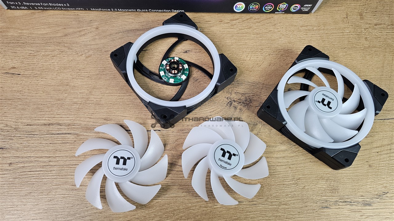Same wentylatory wyposażono w podświetlenie ARGB w dwóch strefach – centralnej oraz w formie pierścienia wokół wirnika. Taka konstrukcja poprawia efekt wizualny, ale jednocześnie wymusza zastosowanie mniejszego wirnika o średnicy około 101,4 mm, co ma bezpośredni wpływ na wydajność. W przypadku zastosowania wirników typu reverse należy dodatkowo liczyć się z dalszym spadkiem efektywności – zarówno ze względu na ich konstrukcję, jak i fakt, że powietrze przepływa przez radiator w przeciwnym kierunku, co zwiększa opory przepływu.