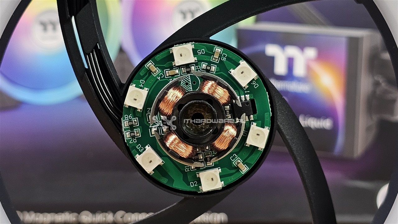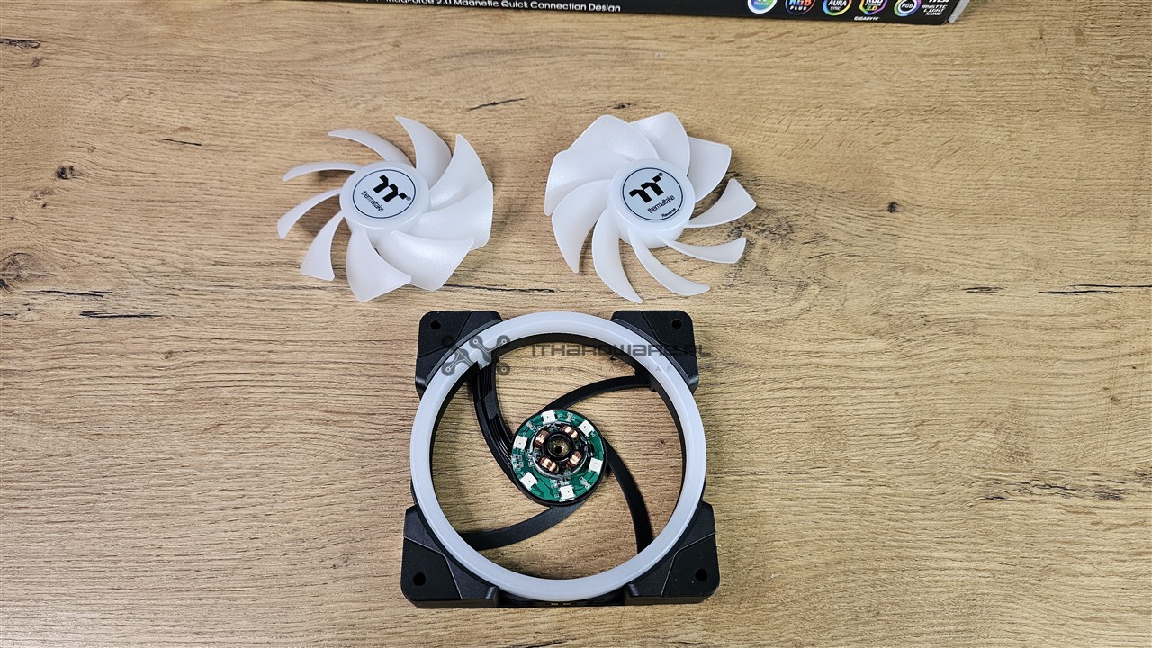 Zestaw Thermaltake MAGFloe 360 Ultra ARGB Sync wyposażono w trzy wentylatory Thermaltake SWAFAN EX12 ARGB Sync, które wyróżniają się na tle standardowych konstrukcji przede wszystkim modułową budową oraz sposobem łączenia. Producent zastosował tutaj magnetyczny system MagForce 2.0, dzięki któremu wentylatory można łączyć w jeden blok bez użycia klasycznego okablowania pomiędzy jednostkami, co znacząco upraszcza montaż i prowadzenie przewodów.
