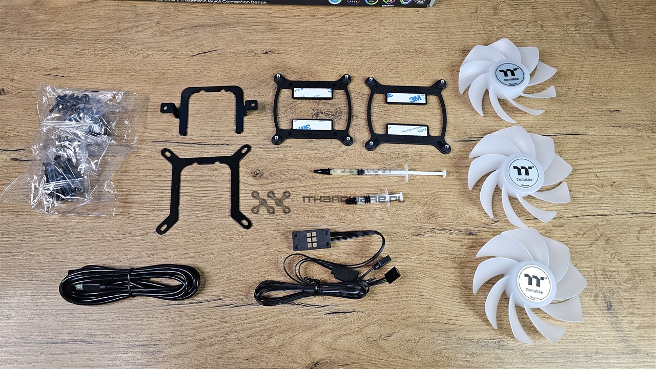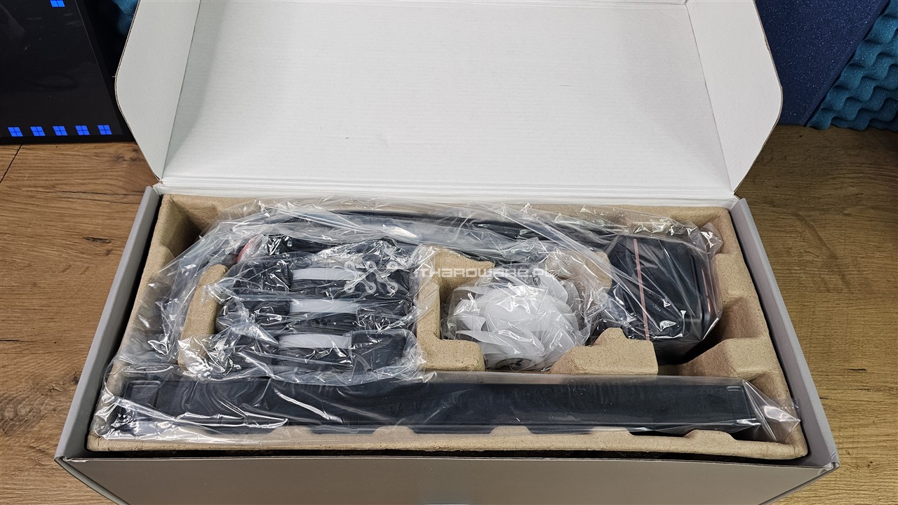 Wewnątrz wszystkie elementy zabezpieczono w formowanej wytłoczce kartonowej. Wentylatory nie są fabrycznie zamontowane na chłodnicy, co oznacza konieczność ich samodzielnej instalacji, ale jednocześnie daje większą swobodę w wyborze kierunku przepływu powietrza. Warto również od razu wspomnieć, że zastosowane wentylatory korzystają z magnetycznego systemu łączenia oraz wymagają tylko jednego przewodu do obsługi całego zestawu – do tego aspektu wrócę szerzej w dalszej części testu. Na minus należy odnotować brak plastikowych organizerów do prowadzenia węży.