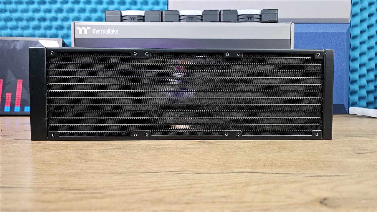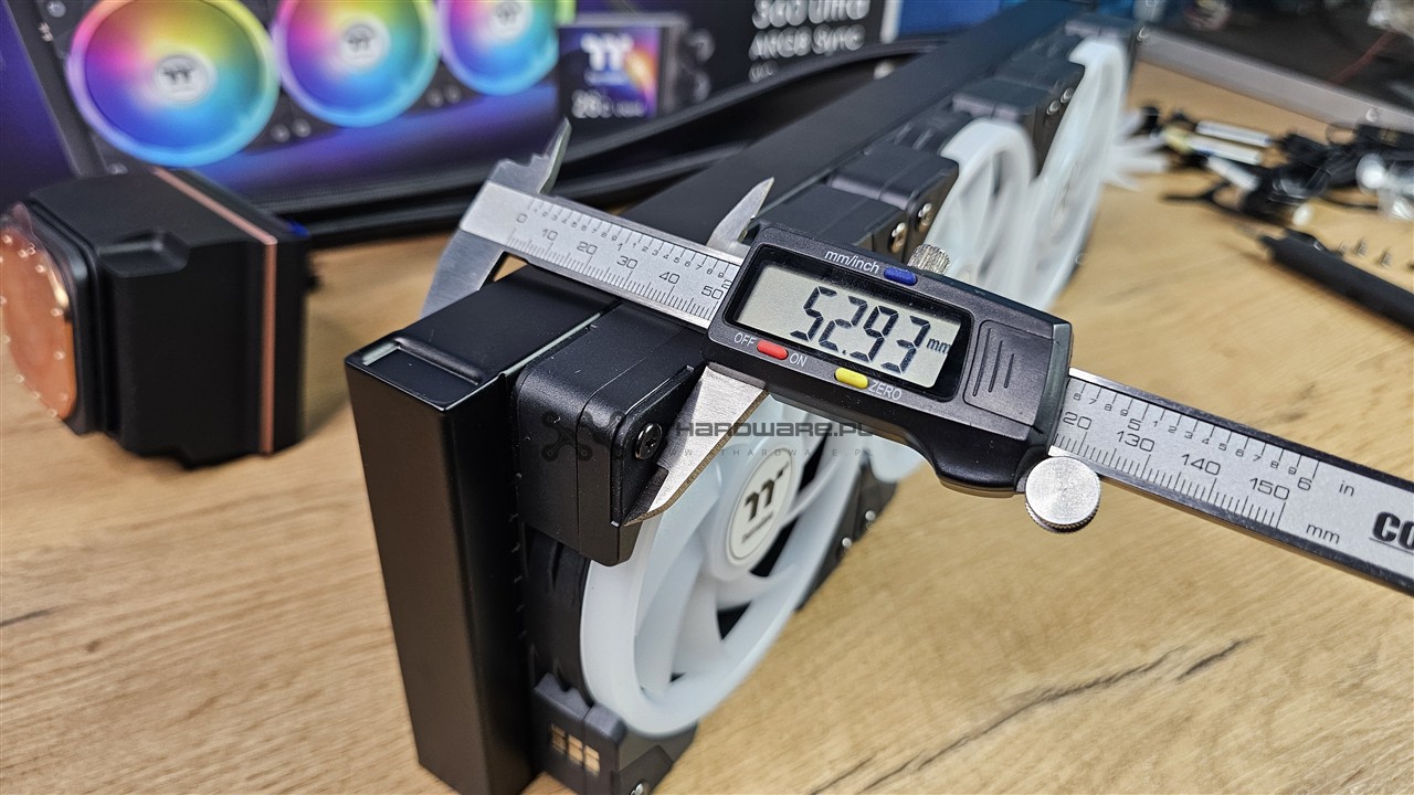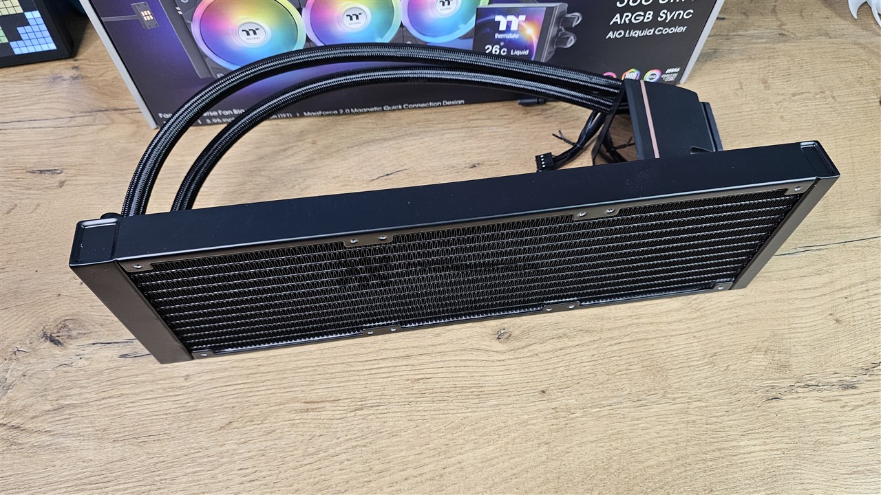 Radiator w Thermaltake MAGFloe 360 Ultra ARGB Sync wykonano z aluminium i ma on wymiary około 396,0 × 120,0 × 27,0 mm, co odpowiada standardowi chłodnic 360 mm stosowanych w AiO tej klasy. Sama grubość radiatora wynosi ok. 27,3 mm, a wraz z wentylatorami całość zajmuje około 52,9 mm przestrzeni w obudowie. Wentylatory nie są fabrycznie zamontowane do radiatora, co daje większą swobodę w konfiguracji kierunku przepływu powietrza, ale wydłuża proces instalacji.