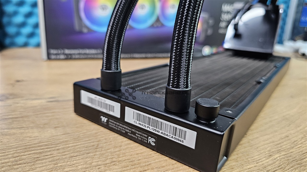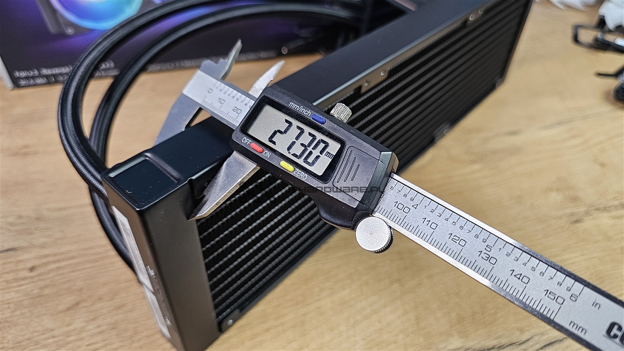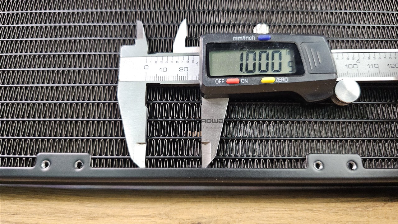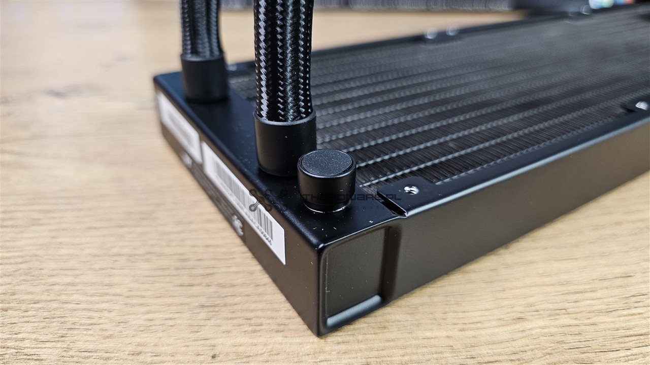 Lamele pomiędzy kanałami wodnymi mają klasyczny, falowany profil. Gęstość upakowania finów wynosi około 20 FPI, co sprzyja współpracy z wentylatorami o podwyższonym ciśnieniu statycznym. Radiator jest jednolicie polakierowany na czarno. Węże wprowadzono do komory końcowej przez plastikowe zakuwki, posiadają one materiałowy.