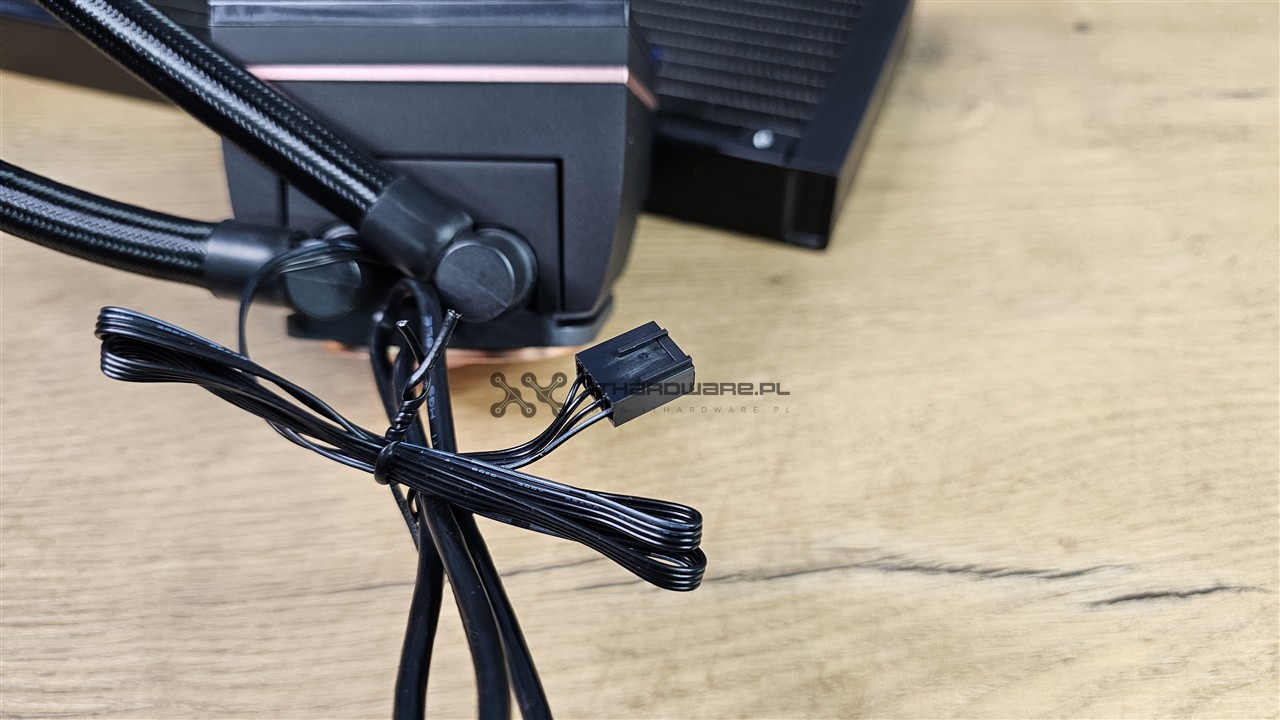 Blokopompka mocowana jest za pomocą dwóch śrub, a ruchome króćce węży ułatwiają jej ustawienie nawet w bardziej wymagających obudowach. Na plus zasługuje system łączenia wentylatorów – magnetyczne złącza ograniczają liczbę przewodów, jednak przy montażu warto zwrócić uwagę na orientację modułu. Złącza z pinami nie powinny znajdować się od strony węży, ponieważ może zabraknąć miejsca na podpięcie przewodu. W praktyce do pełnej konfiguracji wystarczy podłączyć zasilanie pompki oraz przewody ARGB i PWM, co pozwala na zachowanie stosunkowo uporządkowanego wnętrza obudowy.