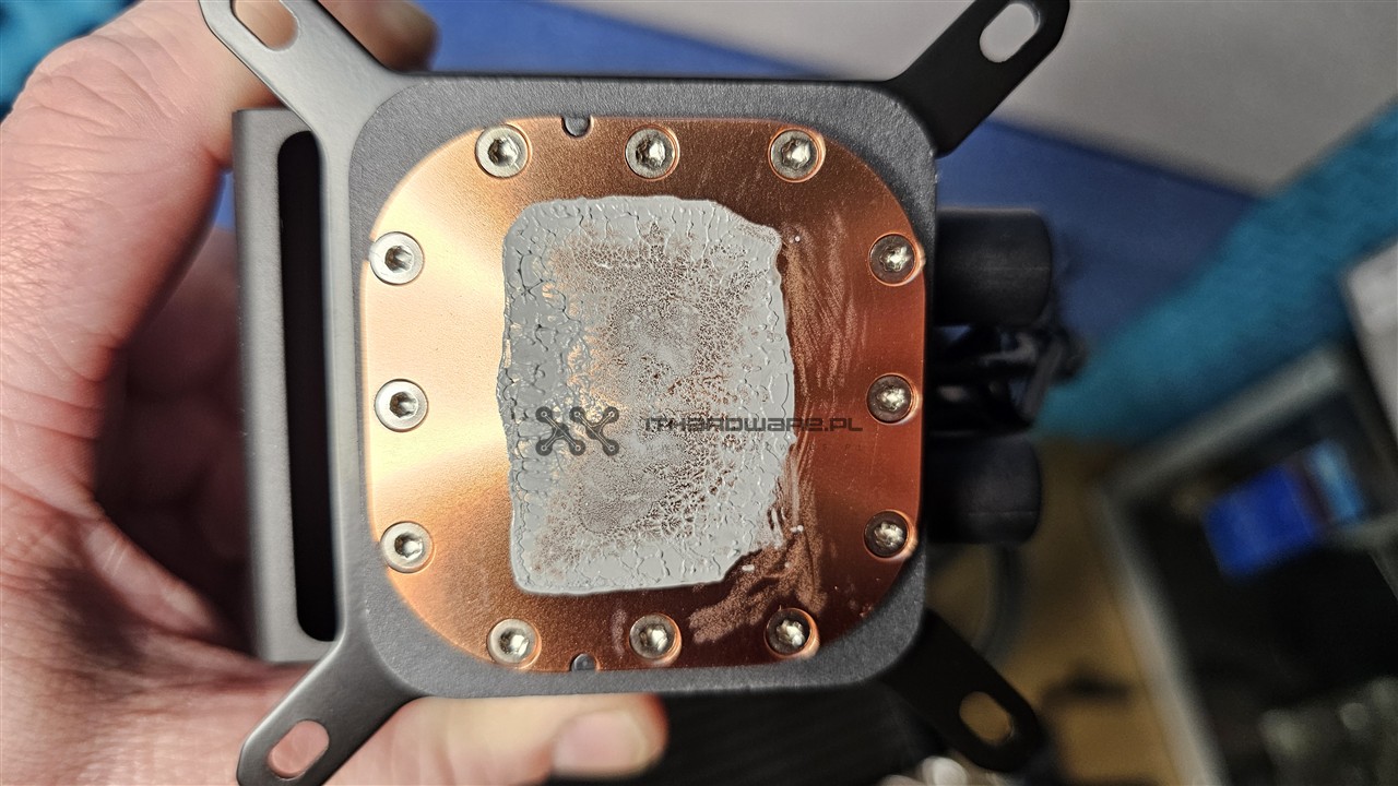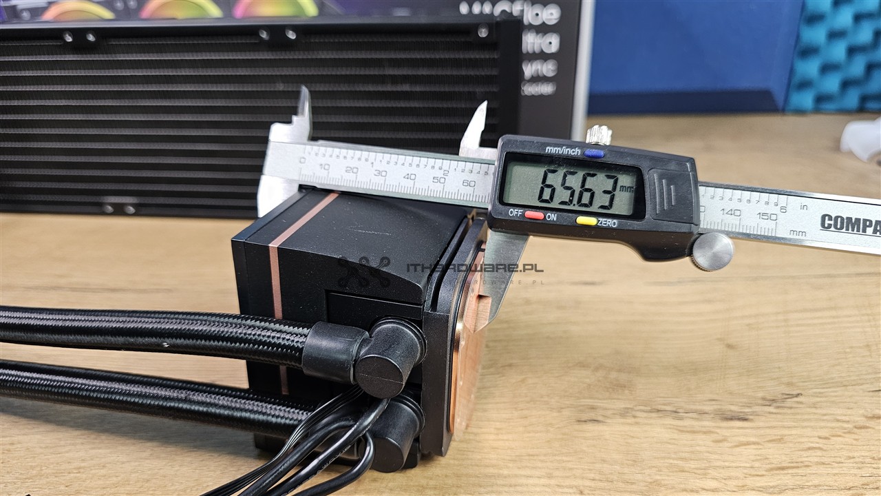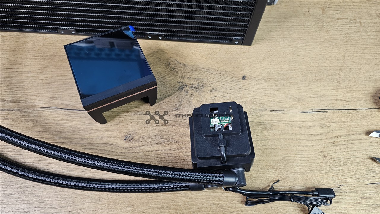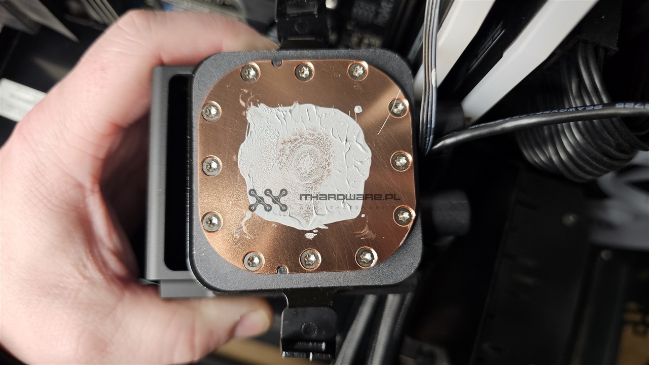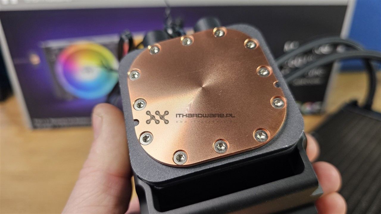 Nie jest to jednak chłodzenie idealne. Wirniki reverse wyraźnie obniżają wydajność, szczególnie na platformie AMD. Brak offsetowego montażu dla AM5 również nie pomaga, a w tej klasie cenowej można oczekiwać bardziej dopracowanego zestawu montażowego. Zastrzeżenia można mieć także do sposobu mocowania topu blokopompki – jego demontaż wymaga użycia siły i przy nieumiejętnym chwycie łatwo uszkodzić ramkę ekranu.