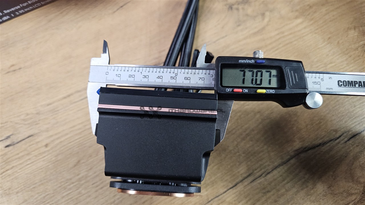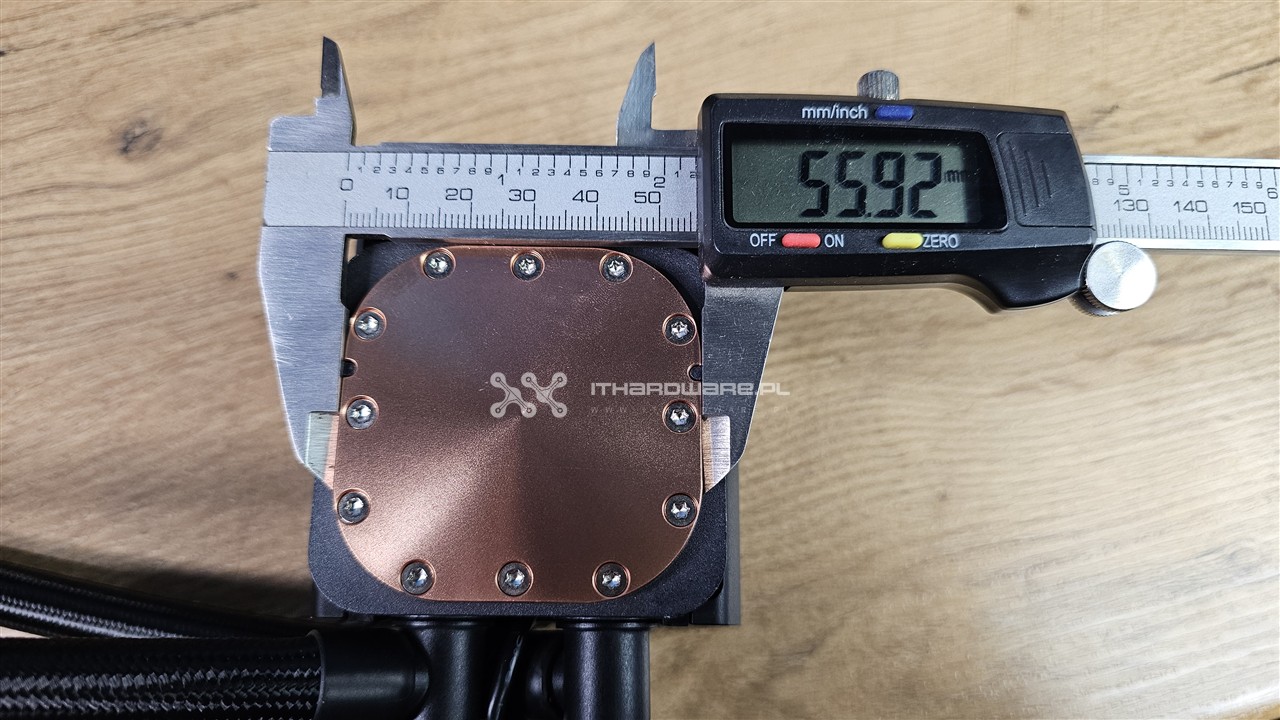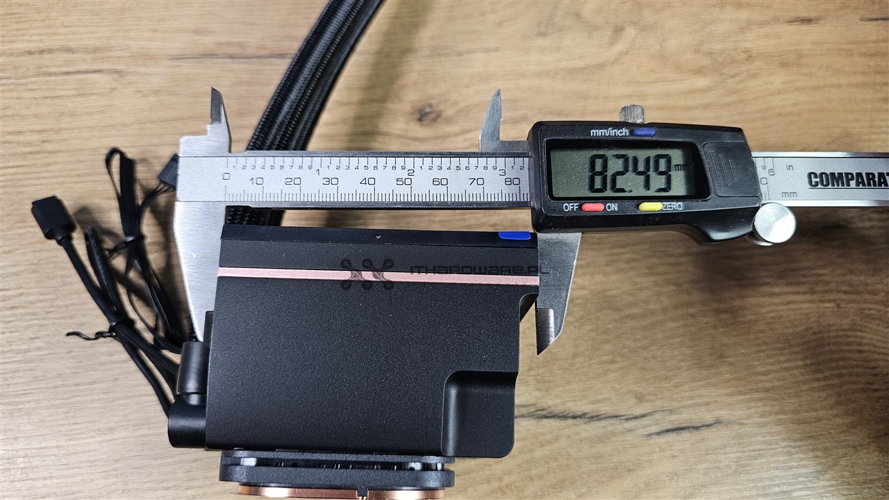 Pomiary suwmiarką wykazały szerokość górnej części bloku na około 78,8 mm, natomiast wysokość całego korpusu wynosi około 52,6 mm. Miedziana zimna płyta ma wymiary około 55,0 × 55,1 mm. Stopa nie jest niklowana i posiada charakterystyczny profil – szerokie, zaokrąglone uformowanie, które zwiększa powierzchnię styku z IHS procesora, co potwierdza równomierny odcisk pasty termoprzewodzącej.
