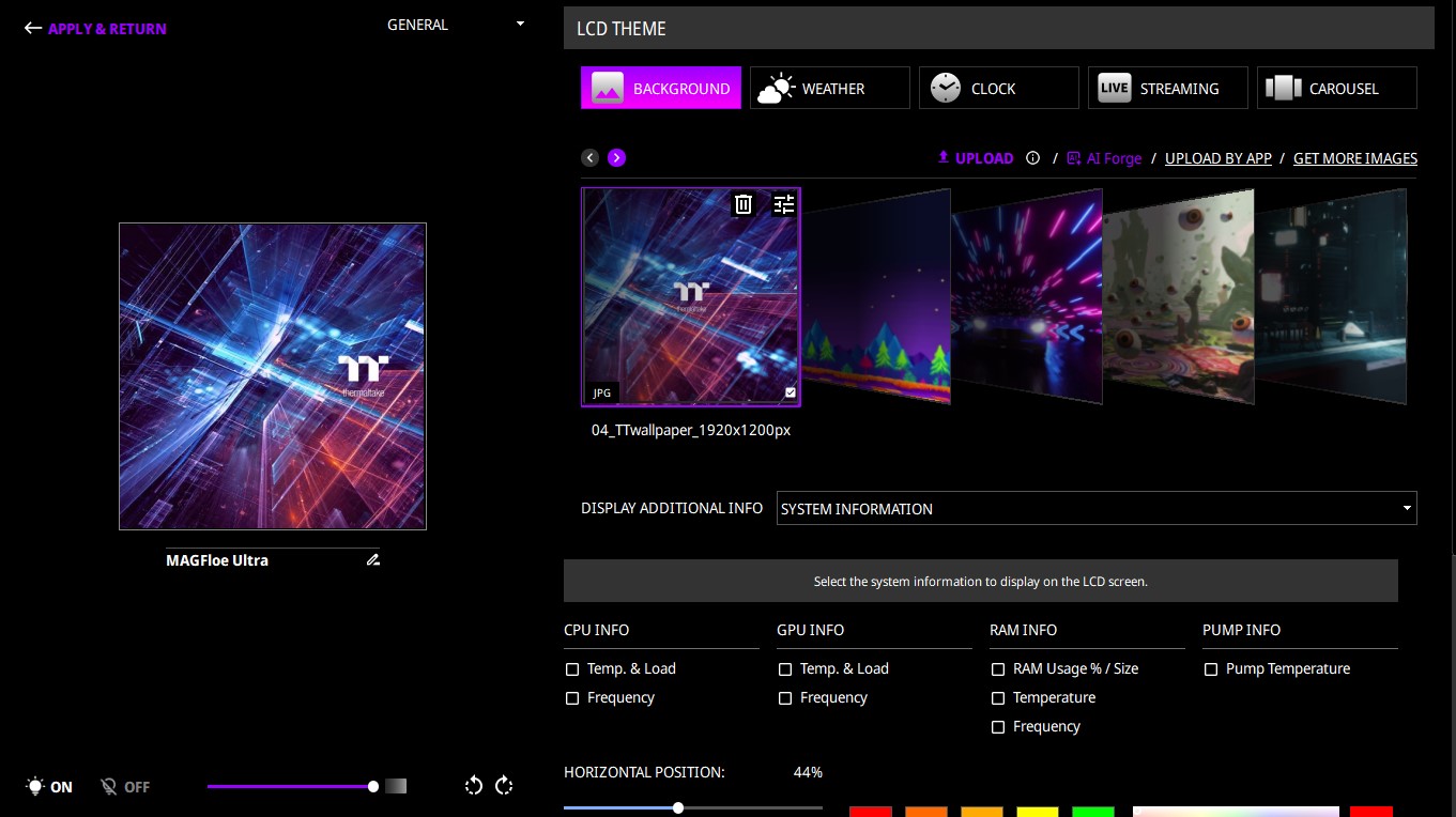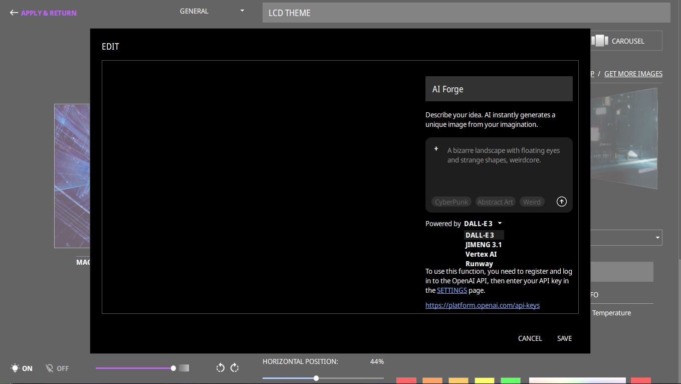 Jednym z najmocniejszych wyróżników Thermaltake MAGFloe 360 Ultra ARGB Sync jest funkcja AI Forge, zintegrowana z oprogramowaniem TT RGB PLUS. Producent nie ograniczył się tutaj wyłącznie do prostego wyświetlania treści na ekranie IPS LCD, ale wprowadził pełnoprawne funkcje sztucznej inteligencji, pozwalające generować własne materiały bezpośrednio z poziomu aplikacji. AI Forge współpracuje z popularnymi modelami AI, takimi jak DALL·E 3, Google Vertex AI czy Runway, co daje szerokie możliwości zastosowań – od generowania statycznych grafik i ilustracji, przez bardziej zaawansowane wizualizacje, aż po materiały wideo w przypadku wybranych modeli. To istotna zmiana względem klasycznych rozwiązań, gdzie użytkownik był ograniczony do gotowych zasobów lub własnych plików.