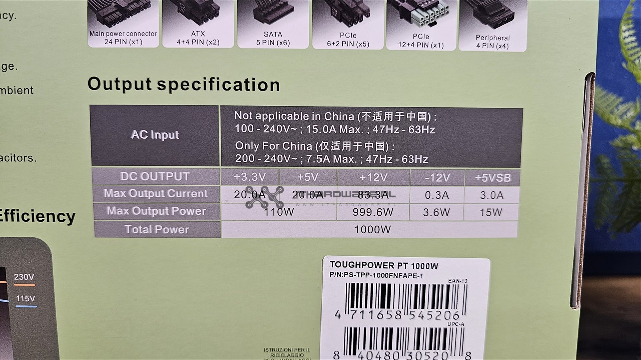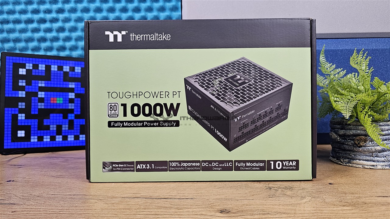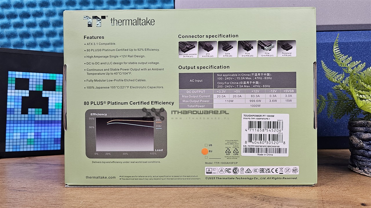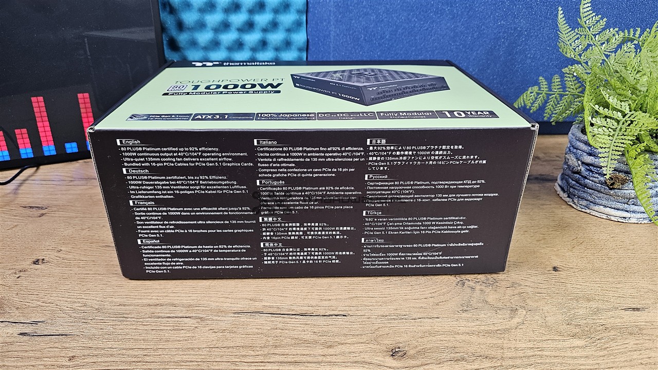 Zasilacz jest zapakowany w charakterystyczny dla marki Thermaltake karton z jasnozielonym frontem i czarnymi elementami. Na jego froncie znajdziemy zdjęcie jednostki, oznaczenie mocy 1000 W, informację o w pełni modularnym okablowaniu, zgodności ze standardem ATX 3.1 oraz natywnym złączu PCIe Gen 5.1 12V-2x6. Producent informuje również o zastosowaniu japońskich kondensatorów elektrolitycznych 105 °C, przewodów z embosingiem oraz 10-letniej gwarancji. Z tyłu opakowania umieszczono listę najważniejszych cech, specyfikację złączy, tabliczkę prądowo-napięciową oraz wykres sprawności energetycznej dla certyfikatu 80 PLUS Platinum.