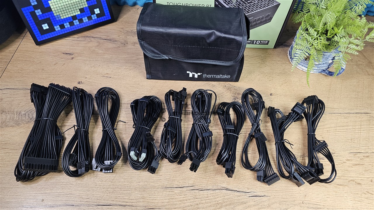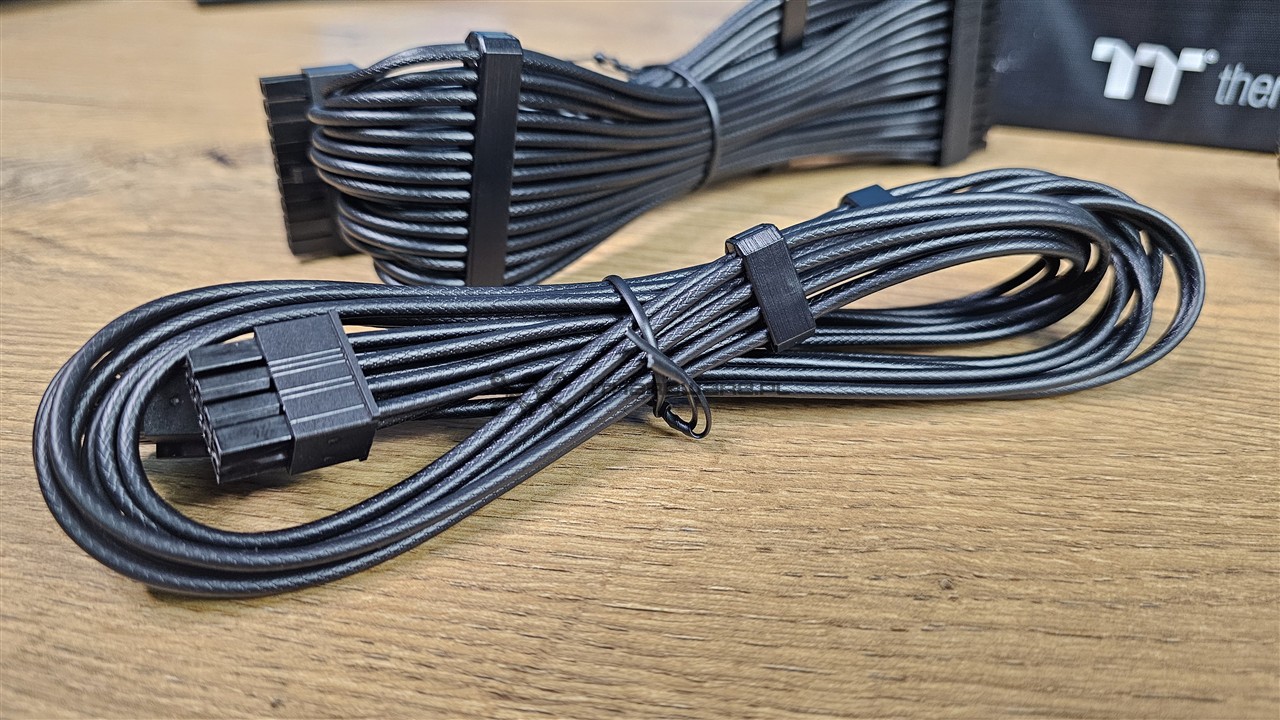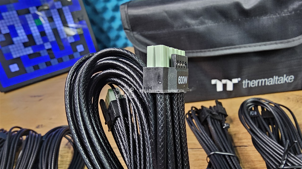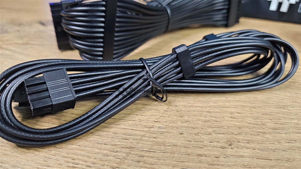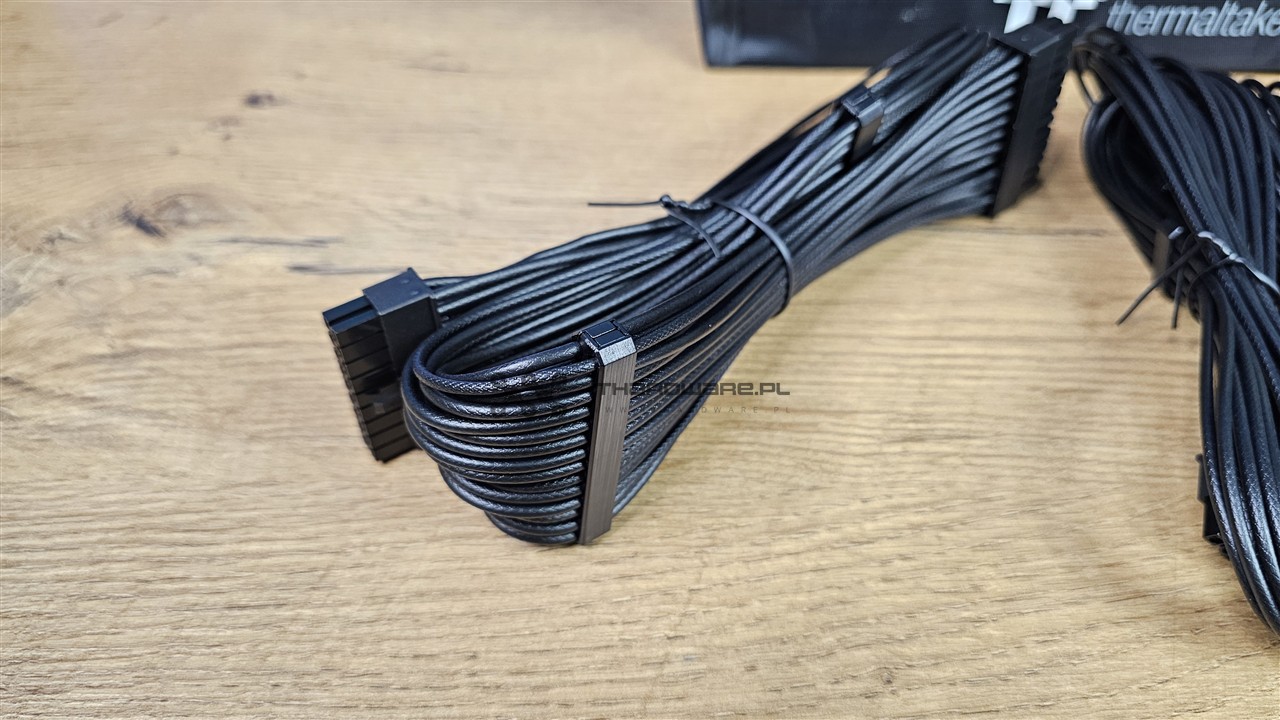 Producent wykorzystał kable o przekroju przewodów 16 AWG i 18 AWG (American Wire Gauge, niższy numer oznacza większy przekrój). Okablowanie jest w pełni modularne i każde złącze zostało odpowiednio opisane. Thermaltake zastosował przewody z indywidualnymi żyłami oraz charakterystycznym tłoczeniem w izolacji, czyli tzw. embosingiem, który imituje oplot. Wygląda to bardzo dobrze, a do tego na głównych wiązkach znajdziemy plastikowe organizery poprawiające estetykę prowadzenia kabli w obudowie.