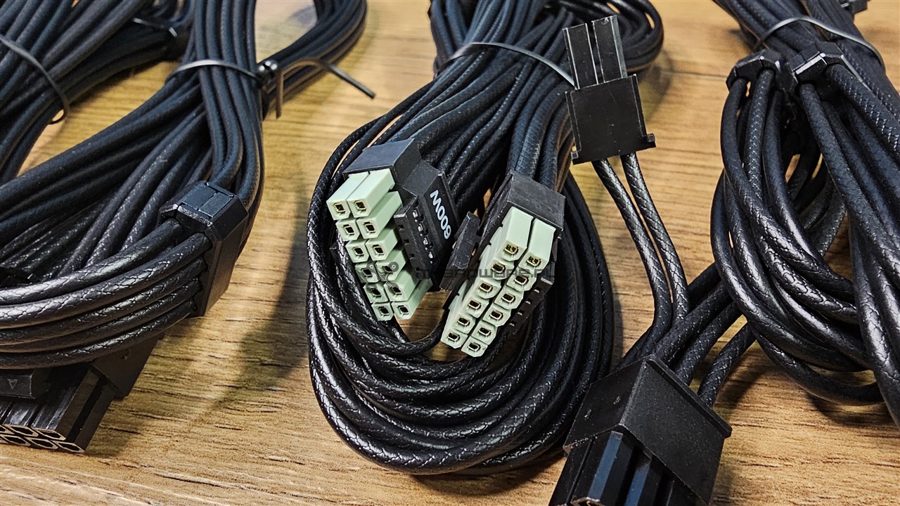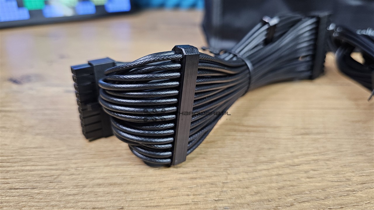 Przewód ATX24 zakończono wtyczką niedzieloną, co zawsze należy uznać za plus. Jak na specyfikację ATX 3.1 przystało, zasilacz posiada złącze PCIe 5.1 12V-2x6 o mocy 600 W, które wyróżnia się zieloną końcówką, podobnie jak w niektórych modelach Corsair czy MSI. Zastosowane przewody są długie, elastyczne i sprawiają bardzo dobre wrażenie jakościowe, a dodatkowe organizery pomagają utrzymać estetykę po montażu.